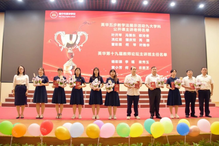 春风化雨育桃李,金秋硕果慰园丁。过去的一年,学校涌现出一批批优秀的教育工作者。他们在班级管理的细微之处播种希望,在学生成长的道路上点亮心灯,在学校谋发展的征程中兢兢业业。用爱与责任书写着教育的华章,赢得了学生的敬爱、家长的信赖、学校的认可和社会的赞誉。为鼓励广大教师向优秀看齐,学校对南宁市教育系统优秀教师、英华五步教学法展示活动九大学科公开课主讲教师、英华第十九届教师论坛主讲班主任、招生送生优秀工作者进行了表彰。