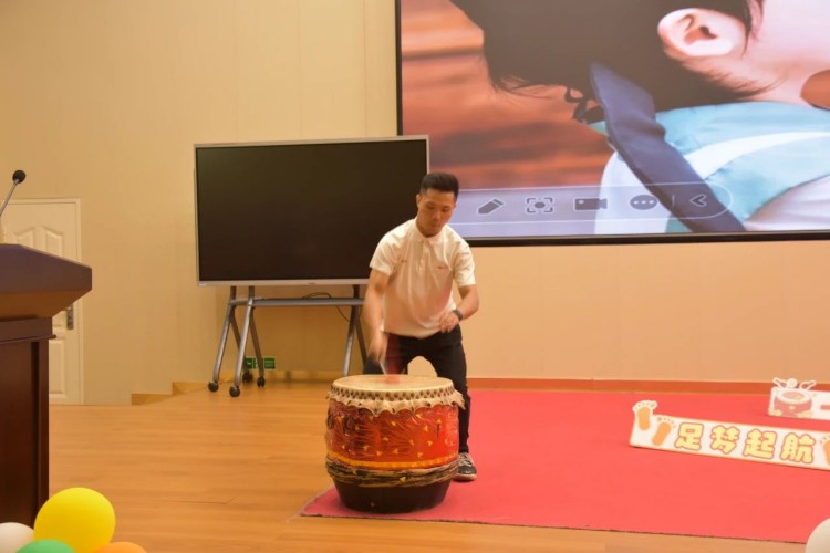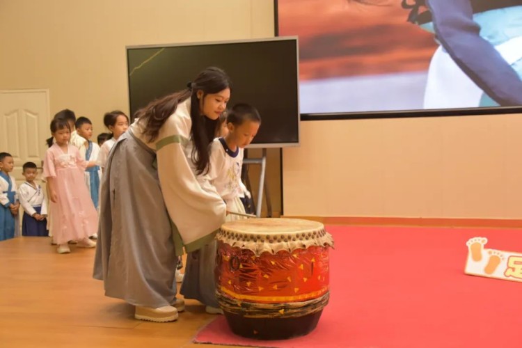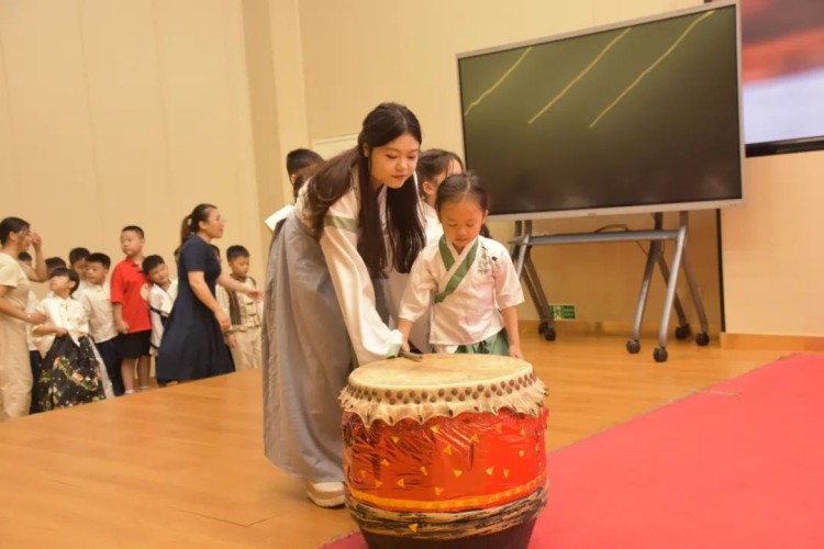在击鼓迎新的环节中,一面古朴的大鼓被放置在舞台上,它仿佛是新学期的使者,等待着被敲响,以宣告新学期的到来。一(1)班班主任梁蕾老师走上舞台,行欢迎之礼。