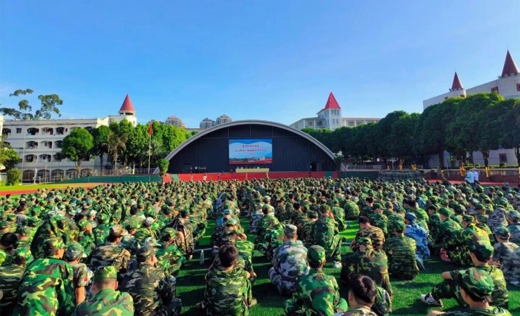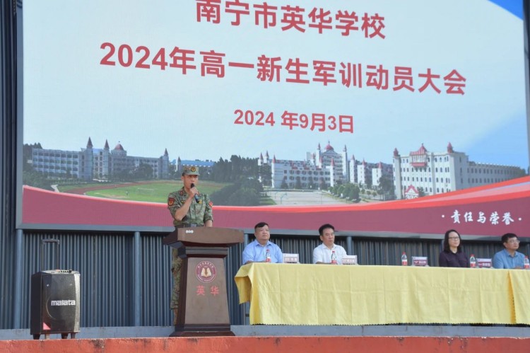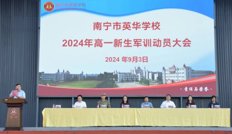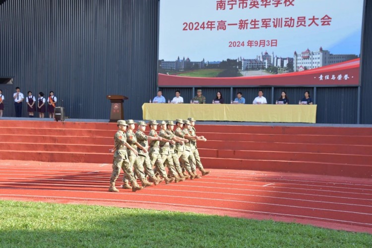 2024年9月3日,南宁市英华学校2024级高一新生军训动员大会在学校足球场举行。陈春丽校长等校领导、良庆区人民武装部全体军训教官、2024级高一全体班主任以及全体学生一同出席动员会。动员会由芮捷副主任主持。