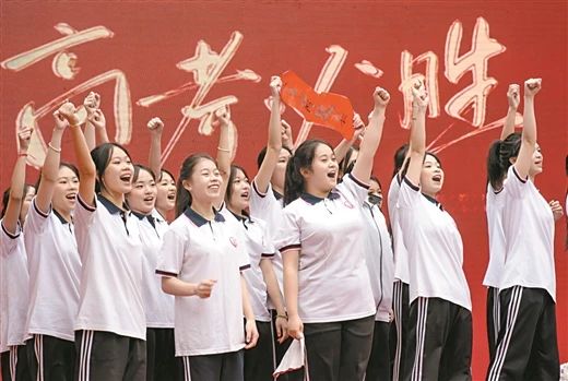 参加2024年广西新高考的考生在互相加油鼓劲。(资料图片) 蓝庆侃、青松/摄