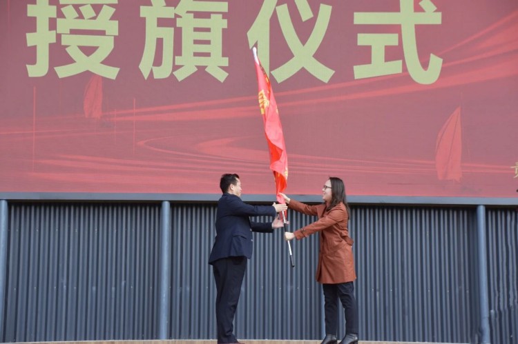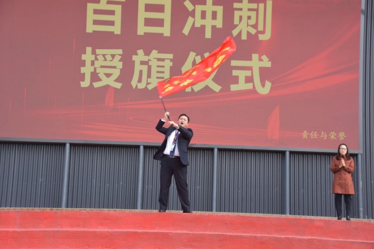 授旗仪式将现场氛围推向高潮。陈春丽校长将象征拼搏与希望的“百日冲刺”战旗授予谢相欣副校长,鲜红的旗帜迎风招展,寓意全体师生将以旗帜为引领,勠力同心、勇攀高峰!