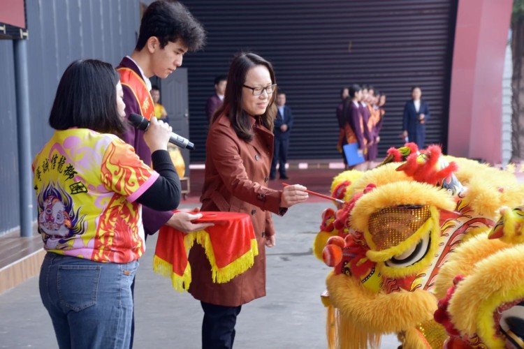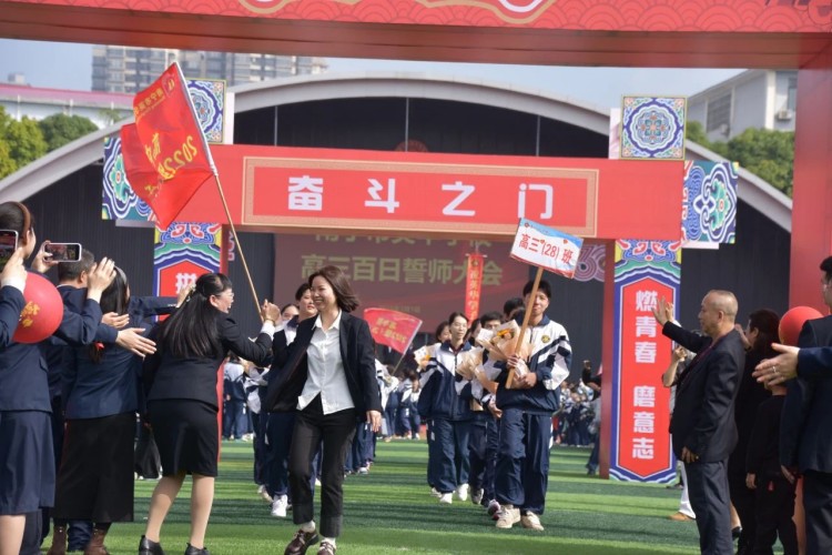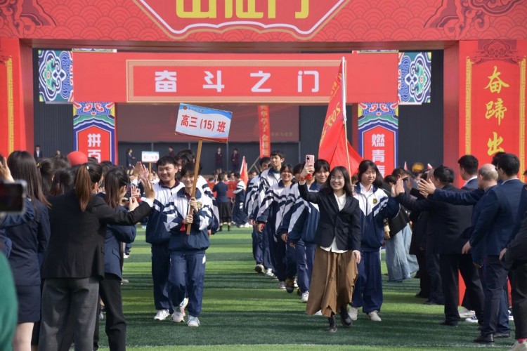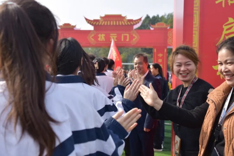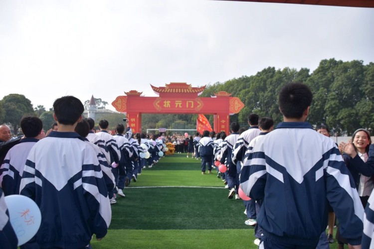 传统文化与励志主题在此刻交融。陈春丽校长为龙狮点睛后,醒狮腾跃起舞,以“登高夺魁”之姿为学子助威。随后,龙狮队引领各班学子依次穿越“奋斗门”“出征门”“状元门”。
