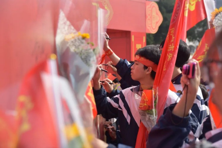 状元门:龙狮恭贺、礼乐激昂,学子们挥笔在签名板上郑重写下姓名与目标,留下对未来的庄严承诺。
