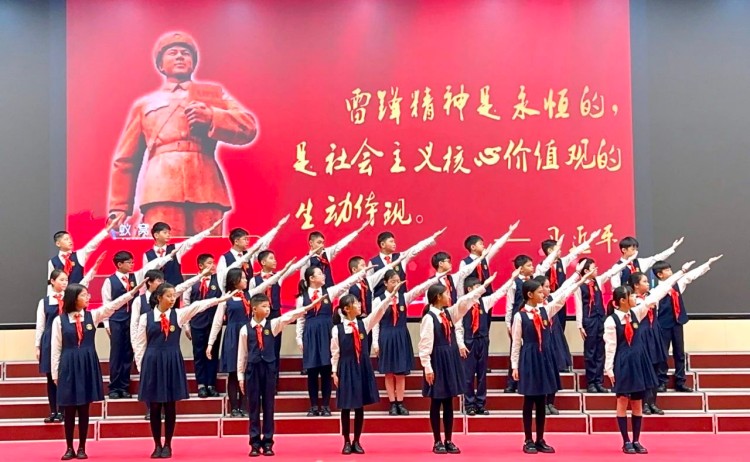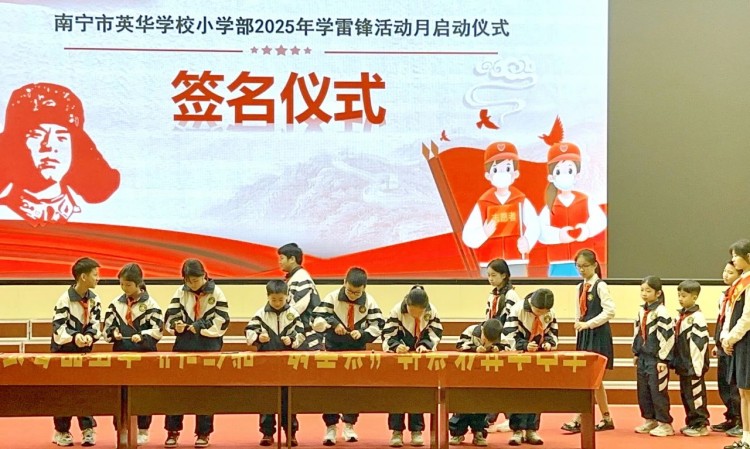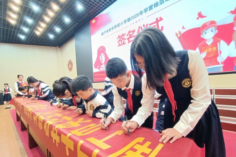 在大队长覃欣愉的带领下,全体同学庄严宣誓,承诺以行动传承雷锋精神,并在《学习雷锋好榜样》的歌声中完成签名仪式,写下践行诺言。