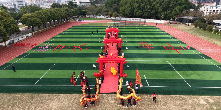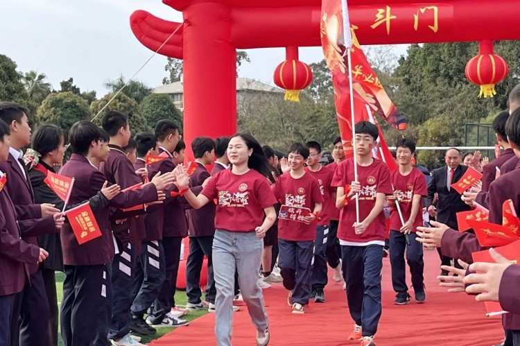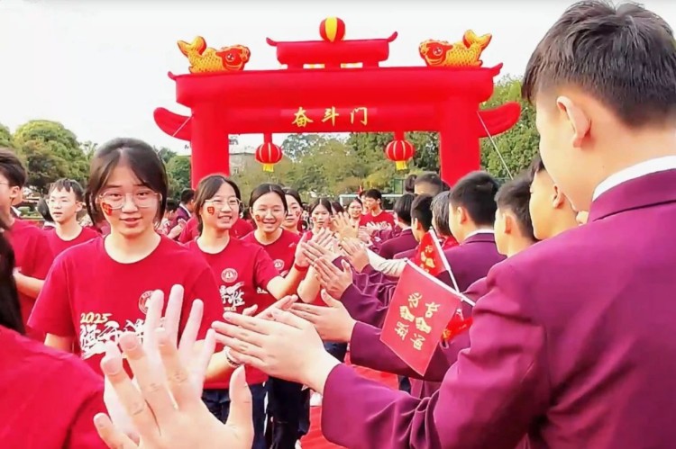 九3班、九2班、九1班学子紧随龙狮,依次穿过“奋斗门”“成功门”“凯旋门”。每道门前,七八年级学弟学妹列队成墙,高喊“英华加油!中考必胜!”,奋力击掌传递力量。学子们步履铿锵,与每一双温热的手掌相击,似电流贯通全身——那是同窗的祝福,是传承的信念!
