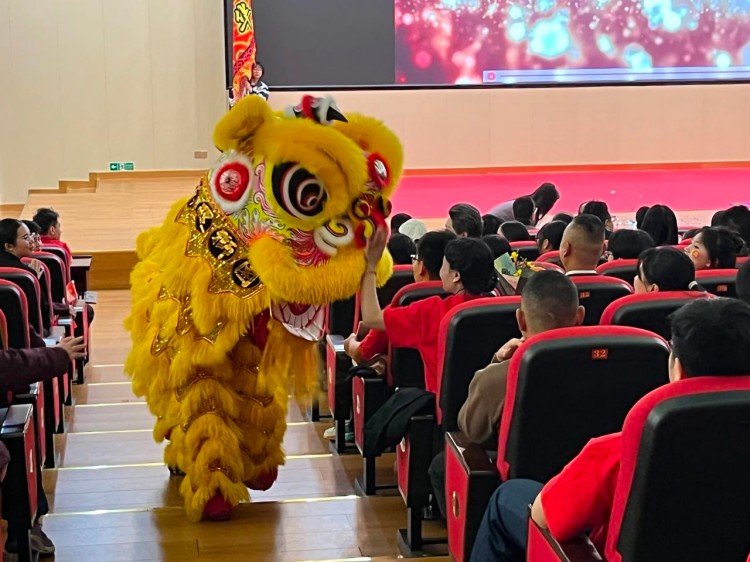 当莘莘学子有序入座后,活力四射的龙狮队精神抖擞地来到报告厅中央。只见金狮身姿矫健,如疾风般腾空翻跃,灵动的步伐与矫捷的身姿相得益彰,将 “狮舞青云” 的神韵展现得淋漓尽致。紧接着,金狮以独特的动作吐出祝福的字幅,“百日功成” 四个大字赫然呈现。