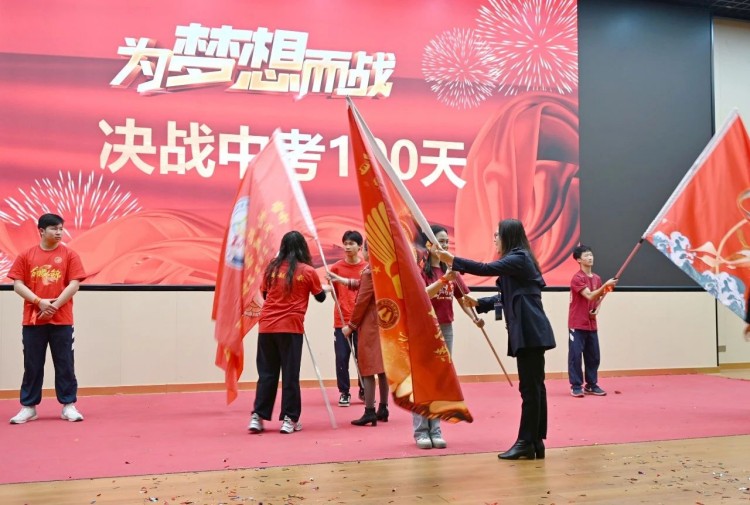 年级组长和各班代表依次上台,庄重地接过象征荣誉与责任的旗帜。旗帜在他们手中挥舞,猎猎作响,仿佛在诉说着师生们团结一心、决胜中考的坚定决心。这旗帜,不仅是力量的象征,更是大家奋勇前行的指引。各班旗手高擎战旗,旗面翻卷似火凤振翅,班主任挥旗呐喊,学子应声如潮,誓言在报告厅穹顶久久回荡!那一刻,时间仿佛凝固,百日的冲刺号角正式吹响,紧张而又充满希望的中考冲刺阶段正式开启。