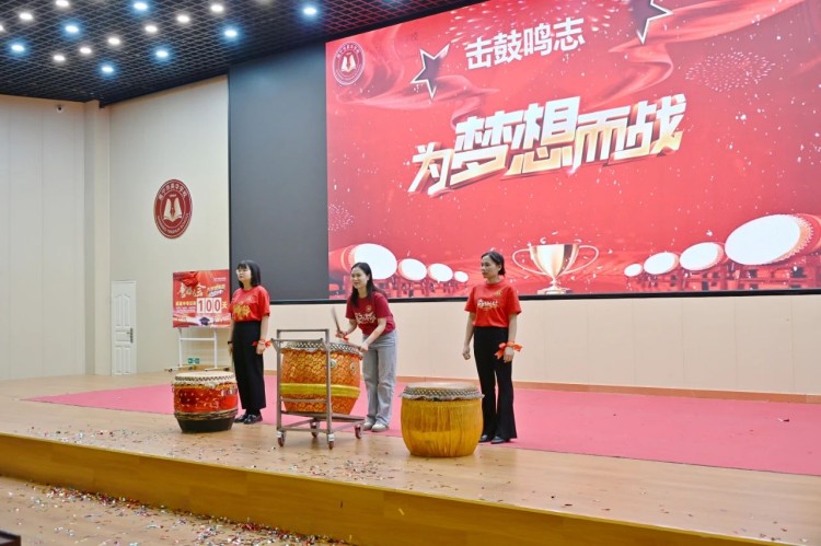 在击鼓鸣志这一振奋人心的环节中,激昂的鼓声阵阵传来,恰似战鼓催征,每一声都重重地撞击着在场每个人的心弦,令人心潮澎湃,斗志昂扬。班主任们身姿挺拔地立于台上,有力地挥动鼓槌,鼓面震动间,激越的鼓点似是在为学子们擂响冲刺的战歌。
