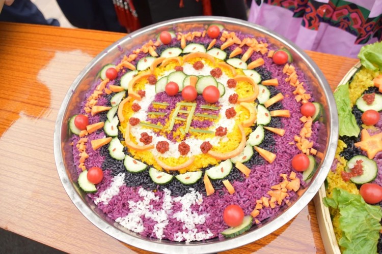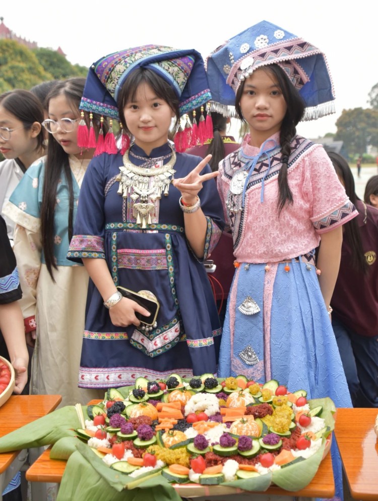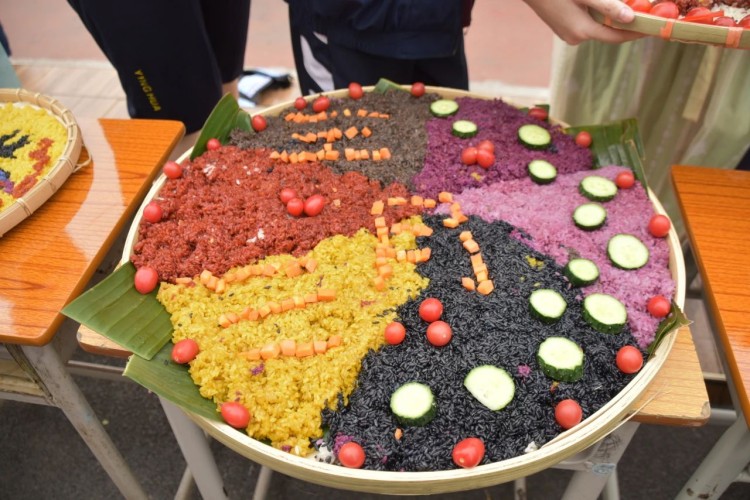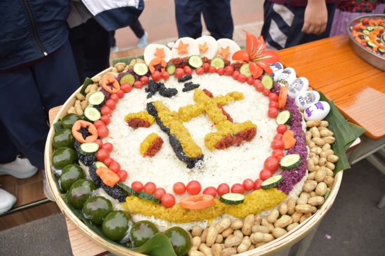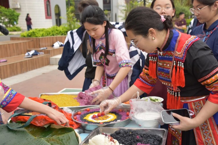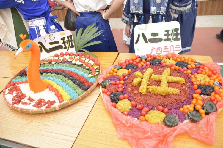 糯米饭造型比拼环节,师生以班级为单位,齐心协力,创意十足。在师生的巧手下,五彩糯米饭拼成形态各异,象征着吉祥如意、风调雨顺的图案。现场充满欢声笑语,大家沉浸在壮族文化的独特魅力之中。