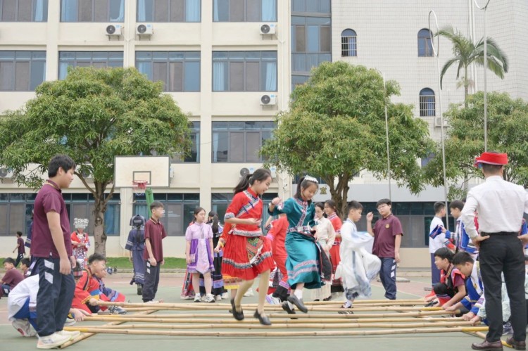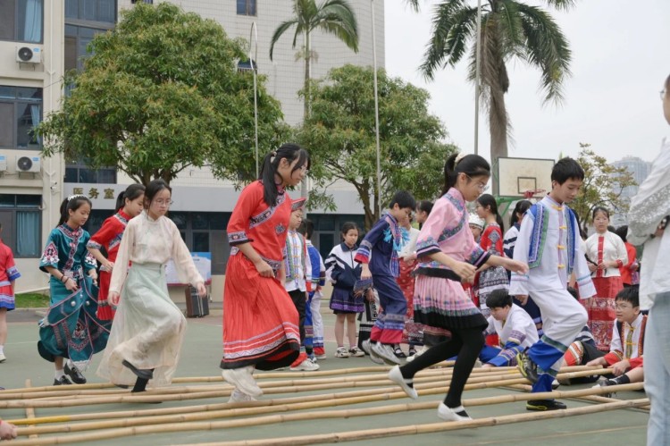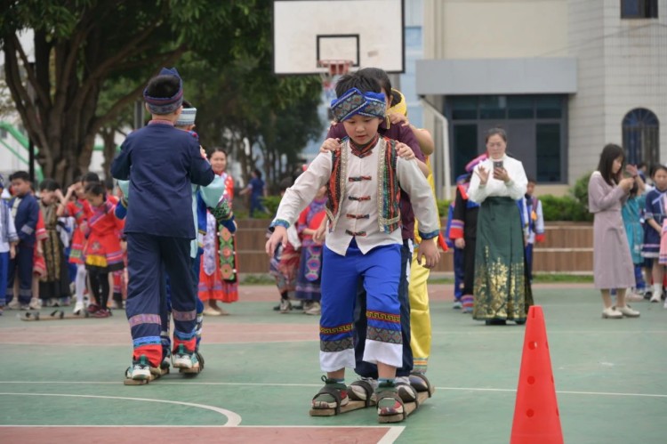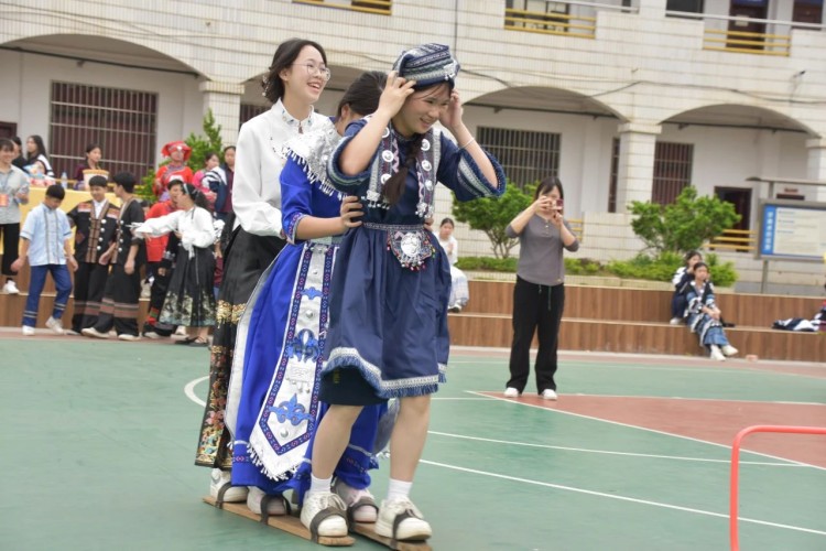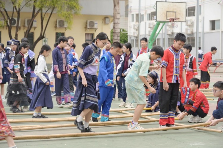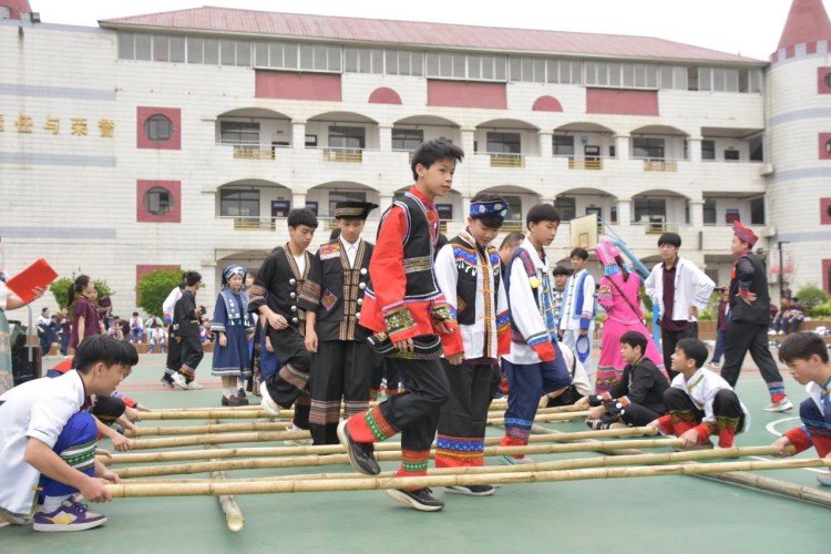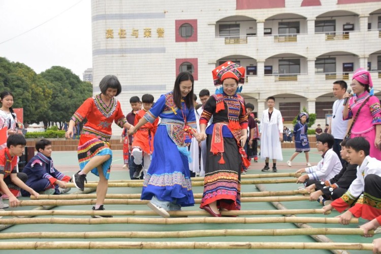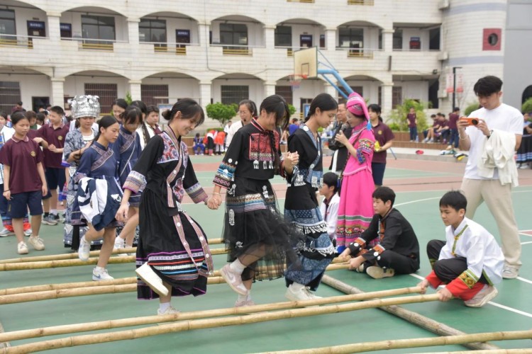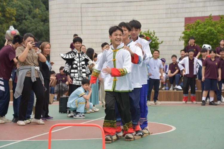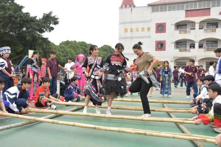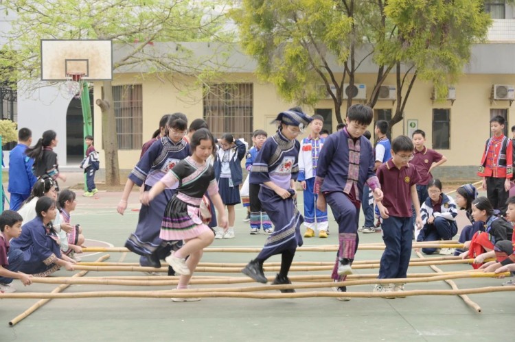 板鞋队伍竞速冲向终点,绣球在空中划出美丽弧度精准地投入背篓,伴随着竹竿敲打的咚咚声,师生们在快速开合的竹竿间轻盈地跳跃,多样的民俗体育运动让大家感受到不一样的民族风情。