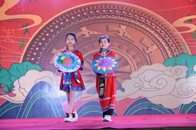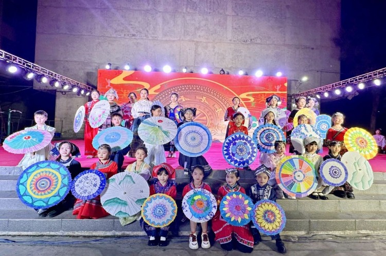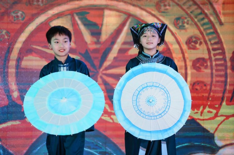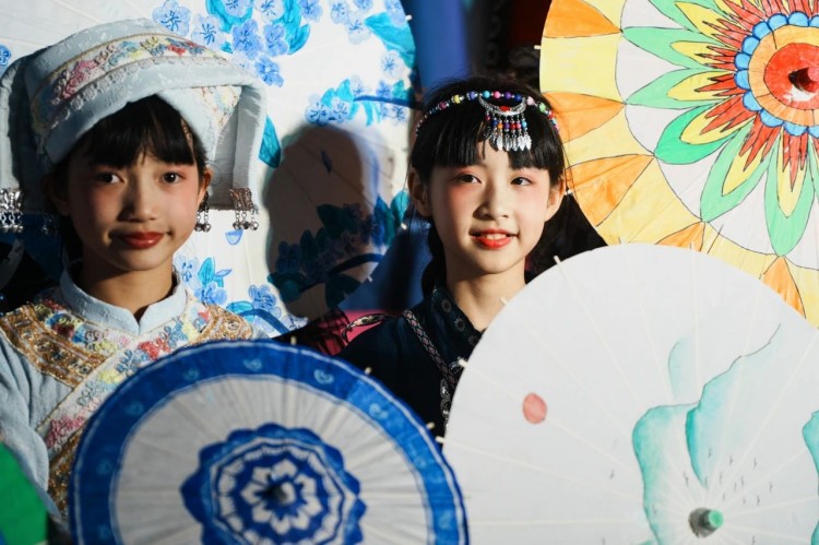 各年级学子带着自己亲手绘制的油纸伞,身穿各民族服饰登台走秀,化身移动的民族文化博物馆。
