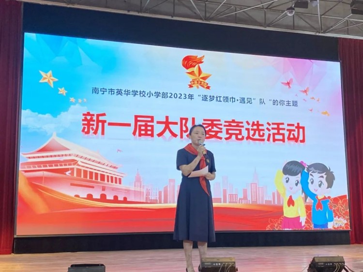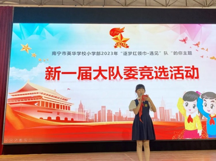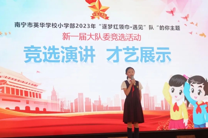 为深入贯彻落实习近平总书记对少年儿童的希望和少先队工作的要求,充分发挥少先队干部在少先队工作中的积极作用,促进学校少先队工作的顺利开展,形成队员自我管理的少先队工作新局面,南宁市英华学校小学部于9月26日开展了主题为“追梦红领巾,遇见‘队’的你”少先队大队委竞选活动。