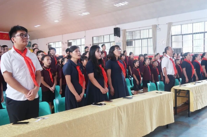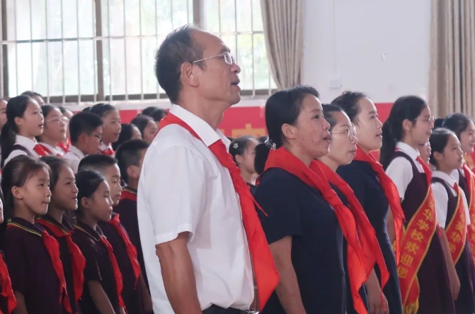 9月26日下午,竞选活动正式开始,少工委领导们、4名中队辅导员代表及64名少先队员代表组成评审团。展示环节开始前,志愿者为少工委领导戴上鲜艳的红领巾,护旗手庄严地将少先队队旗护送至舞台中央,全场齐唱《中国少年先锋队队歌》。