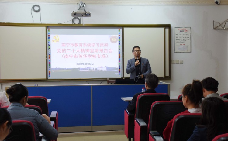 2023年2月23日,南宁市教育系统学习贯彻党的二十大精神宣讲报告会英华学校专场如期举行。南宁市新民中学党总支吴红坚书记受邀为英华学校全体党员和部分青年教师作宣讲报告。中共南宁市英华学校支部委员会许文锋书记主持本次报告会。