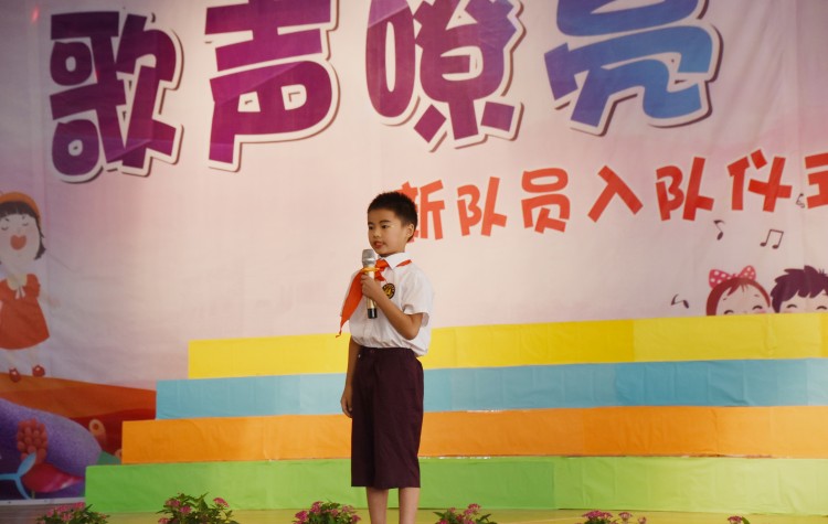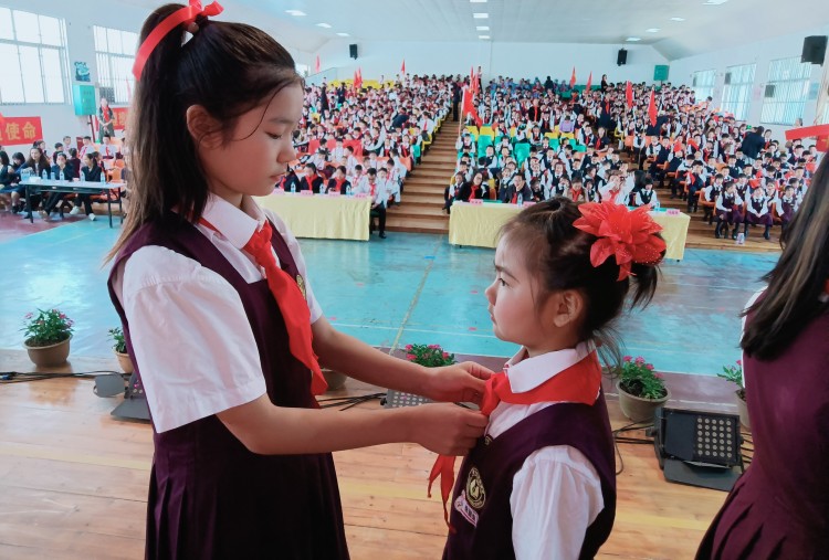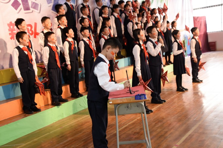 入队仪式上,全体少先队员齐唱《中国少年先锋队队歌》,歌声嘹亮,表达出对少先队的向往与热爱。大队长宣读了新队员名单,老队员为43名新队员佩戴上鲜艳的红领巾。