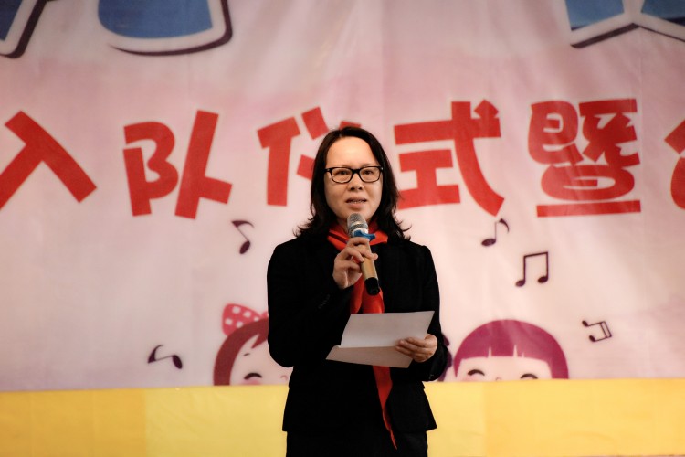 老队员陈春丽校长致辞,欢迎新队员光荣加入中国少年先锋队,希望全体少先队员严格要求自己,在“星星火炬”旗帜的指引下,听党话,跟党走,在学校做先锋好队员,将来为祖国的发展贡献力量。