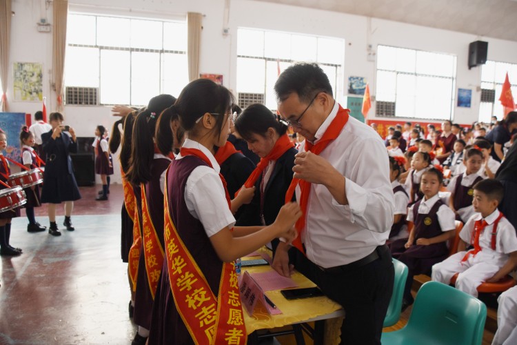 少先队员为来宾佩戴红领巾