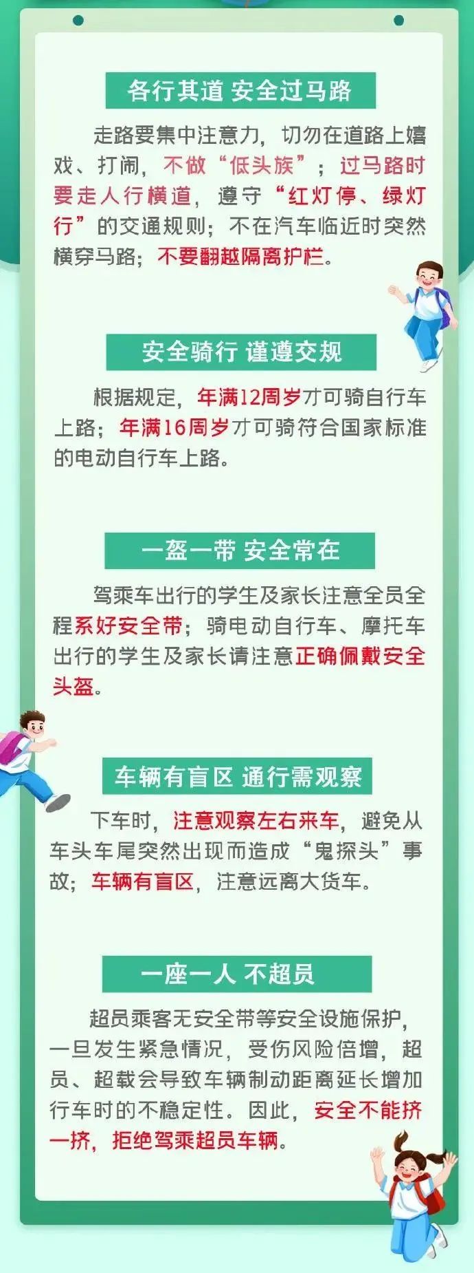 家长要以身作则,严格遵守交通规则。教育孩子遵守交通规则,不在马路上玩耍,防止意外事故的发生;注意人身及财产安全,不乘坐拼装车、报废车、拖拉机和非法营运客车等存在安全隐患的交通工具,不乘坐存在超员、超载的客车;未满16周岁的学生不能骑电动车上路,不能骑改装电车上路,骑乘电动自行车按规定佩戴安全头盔。严禁无证驾驶机动车、酒驾、超载、飙车、逆行等行为。