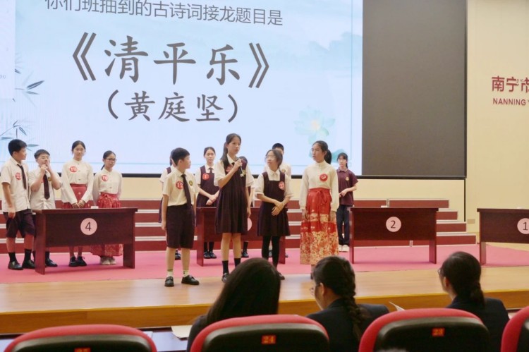 如果说第一环节是稳扎稳打,第二环节诗词接龙赛则是脑力与默契的巅峰对决!每班派出5名“接龙高手”,通过抽签选定诗词题目,五人轮流接续诗句。