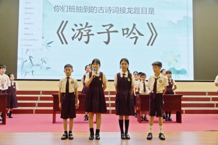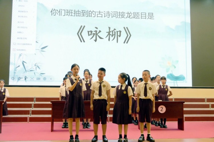 随后,两轮古诗词接龙更是将活动推向了一个小高潮。同学们你一句我一句,诗词在他们之间巧妙传递,思维的火花不断碰撞。“接天莲叶无穷碧”,下一位同学立刻接上“映日荷花别样红”,反应之迅速,令人赞叹不已!