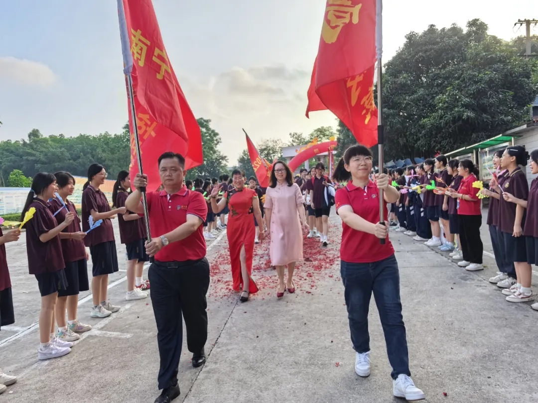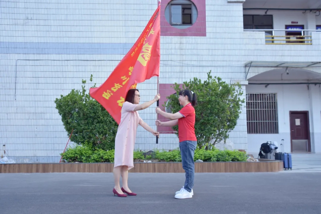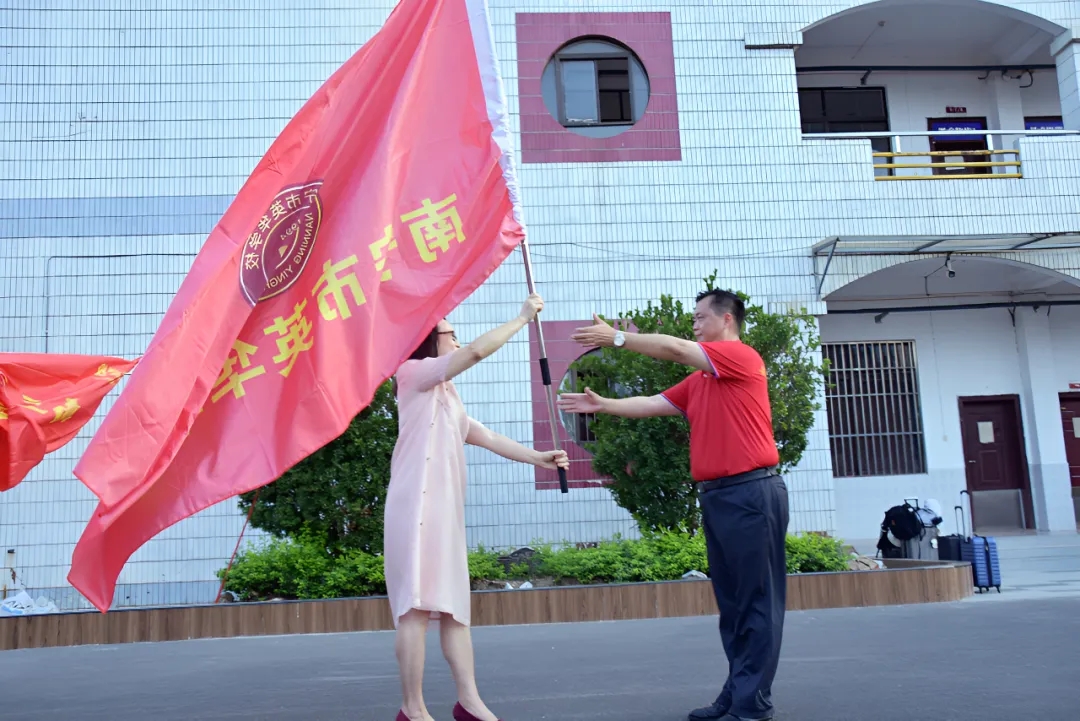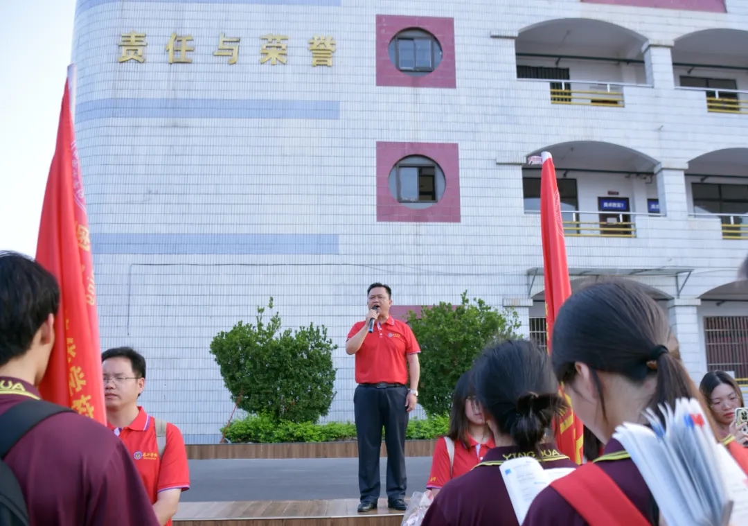 陈春丽校长给高三年级授“得胜旗”,鲜红的战旗迎风飘扬,象征着必胜的决心与勇气。谢副校长带领高三学子呼喊壮行口号:英华加油,高考加油!