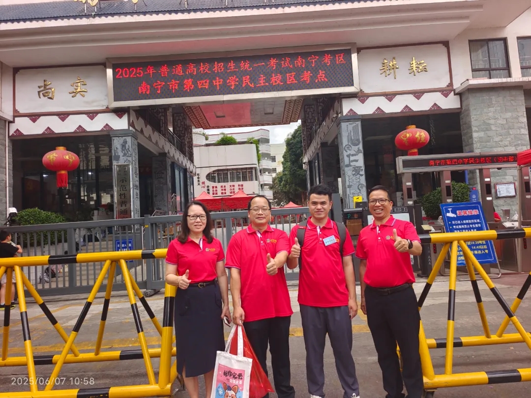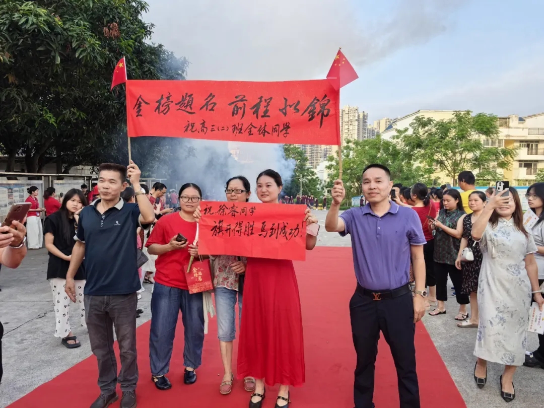 高一、高二年级的送考队伍在校道两侧高举加油横幅、助威牌,齐声呐喊:“高三加油,高考必胜”!一声声加油声响彻校园。