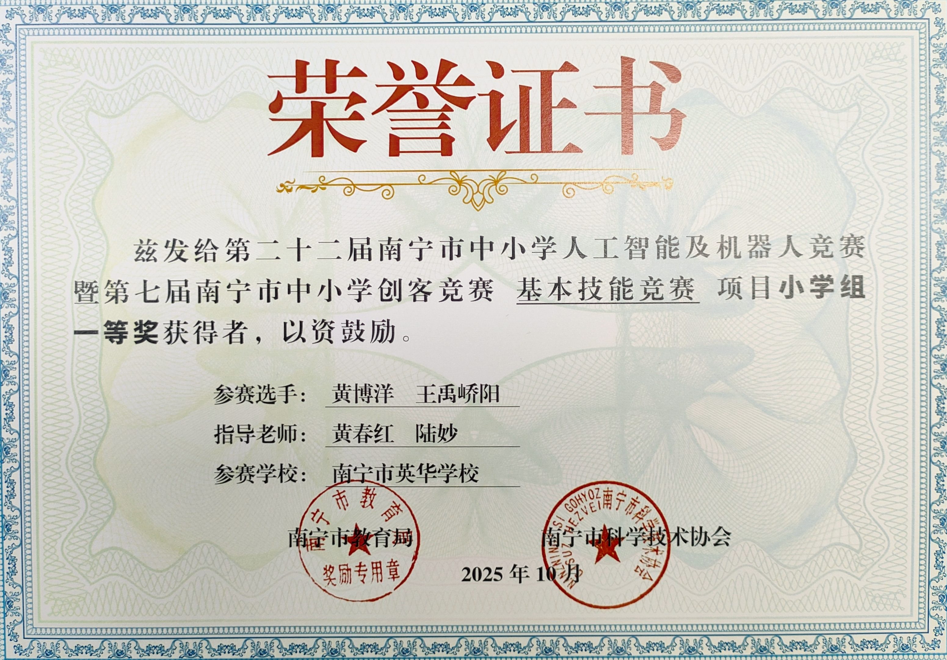 我校黄博洋、王禹峤阳同学在2025年第二十二届南宁市中小学人工智能及机器人竞赛暨第七届南宁市中小学创客竞赛基本技能项目中,获得小学组一等奖!指导老师:黄春红、陆妙。