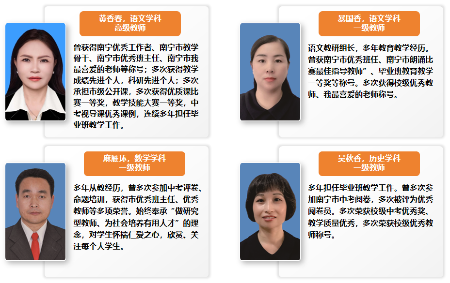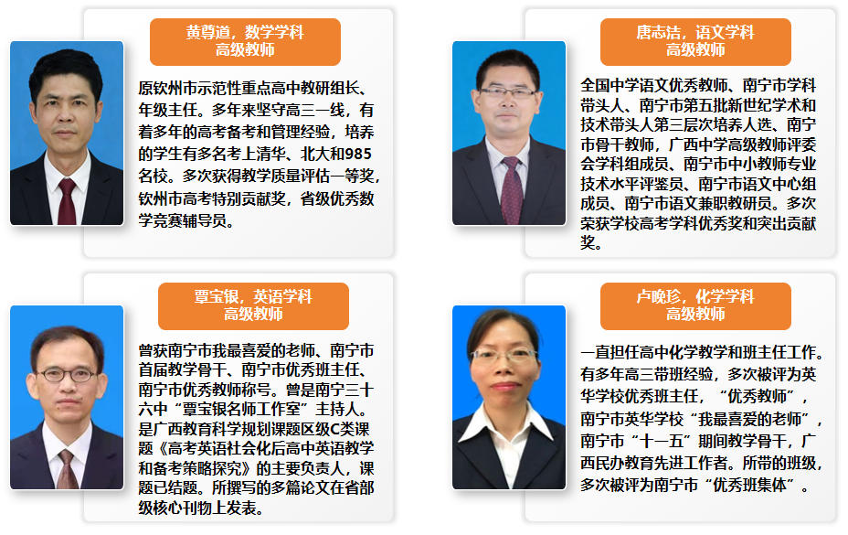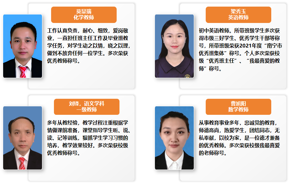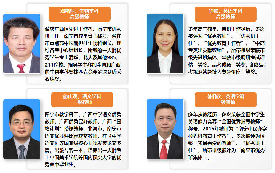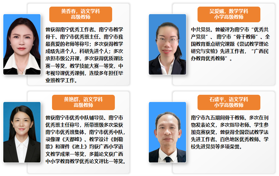 (1)教师团队由教学经验丰富、专业素质高的高级教师组成,具备良好的教育理念和教学方法;(2)班主任由经验丰富的骨干教师担任,责任心强。