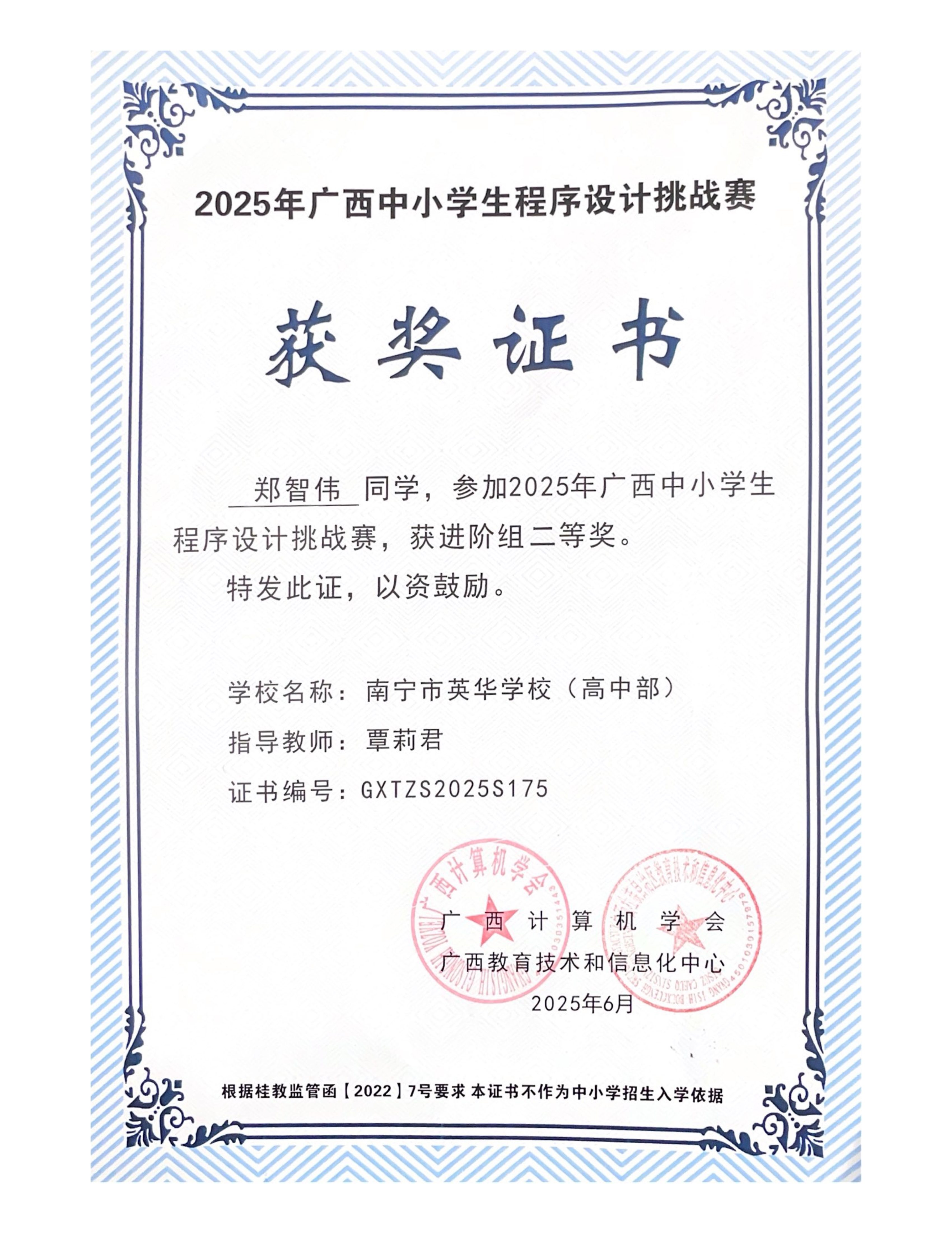 在2025年广西中小学生程序设计挑战赛中,我校高中部郑智伟同学获得进阶组二等奖,指导教师覃莉君。