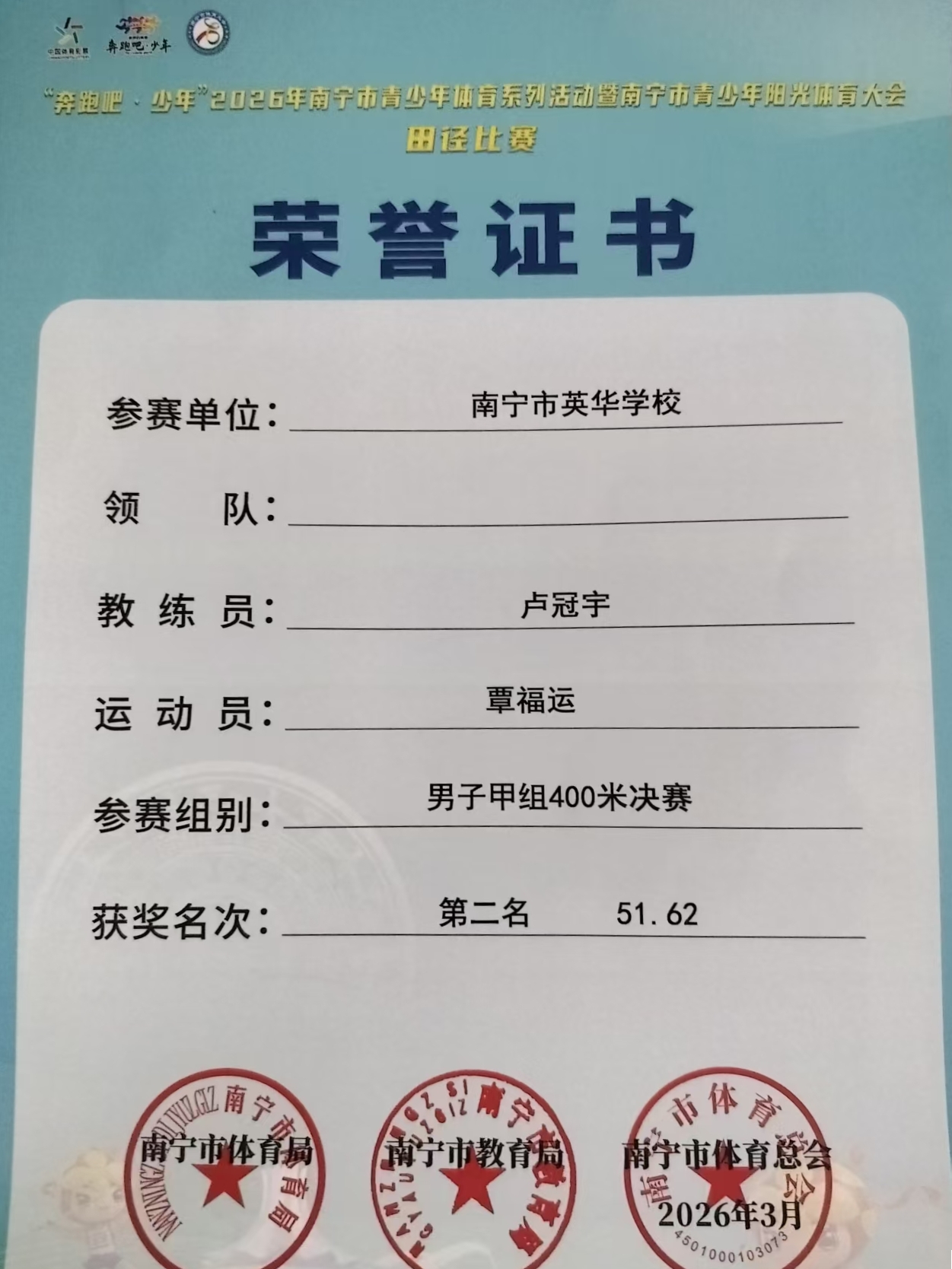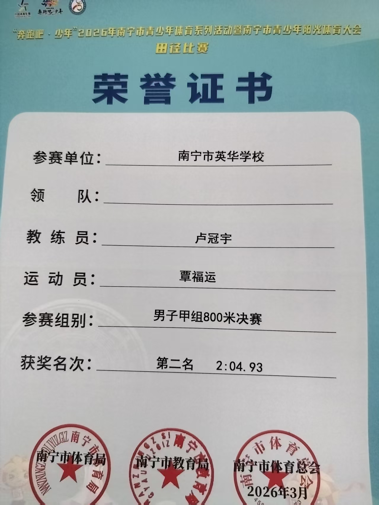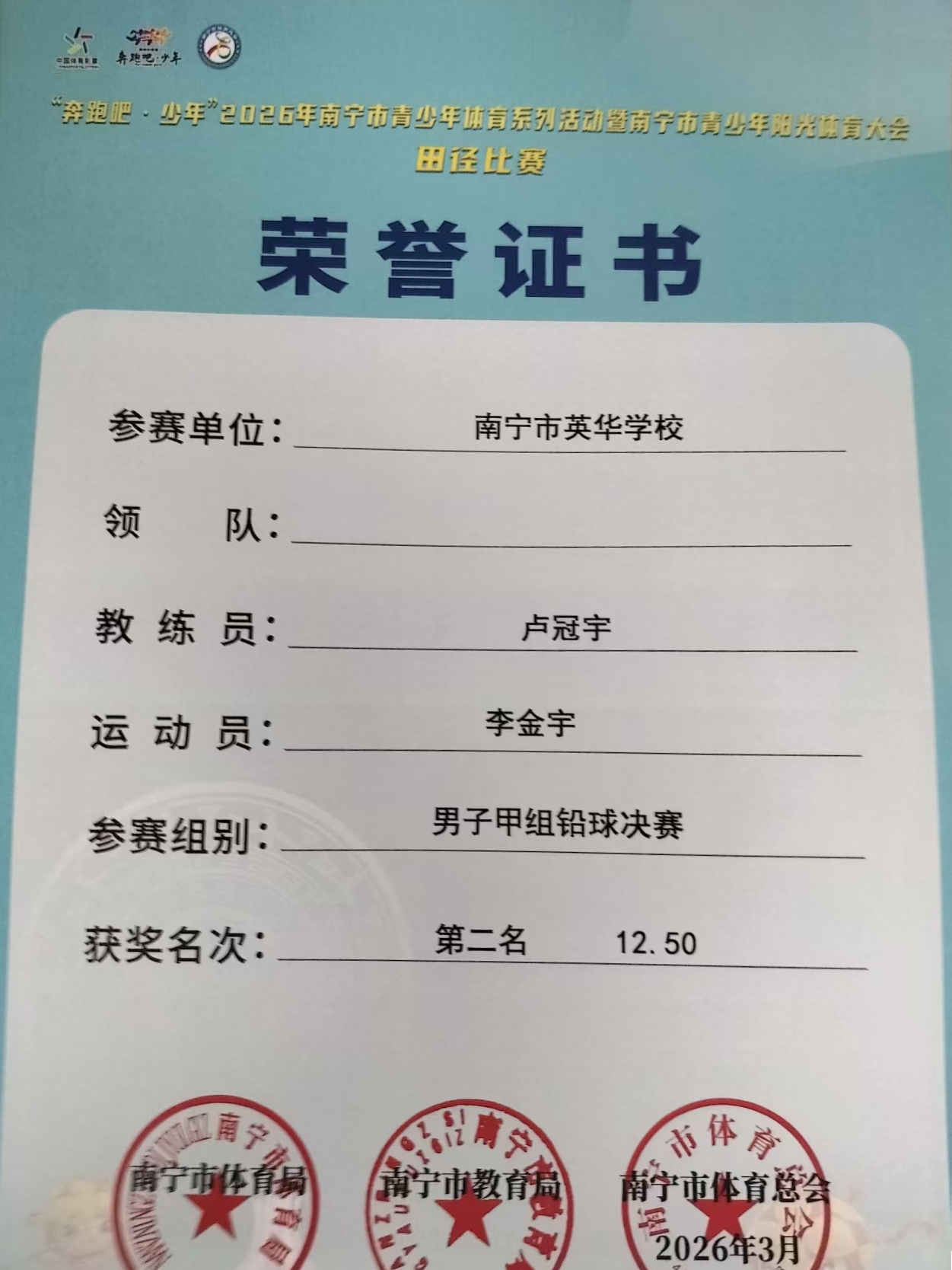 在奔跑吧·少年“2026年南宁市青少年体育系列活动暨南宁市青少年阳光体育大会”中,我校运动健儿收获佳绩、载誉而归!
