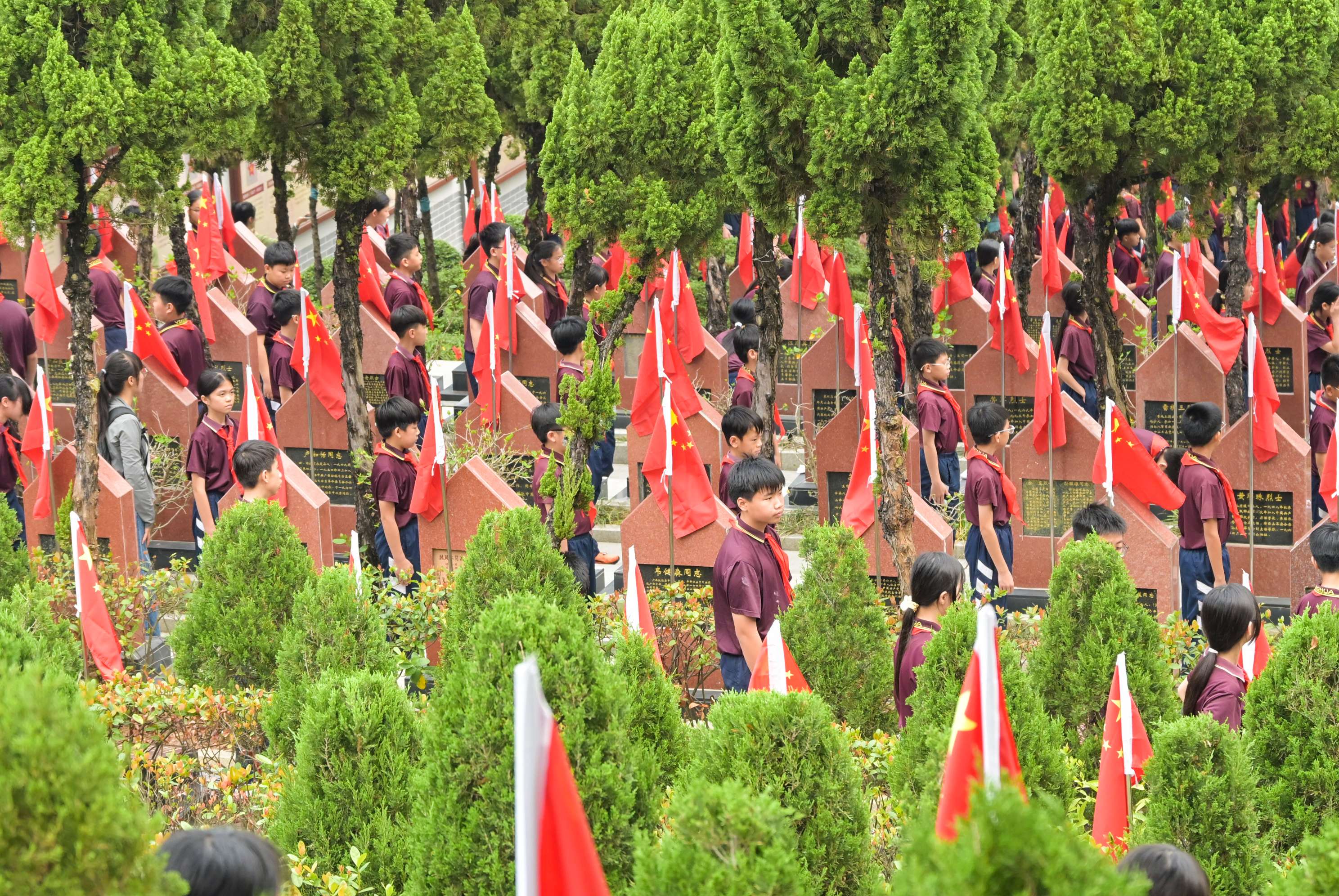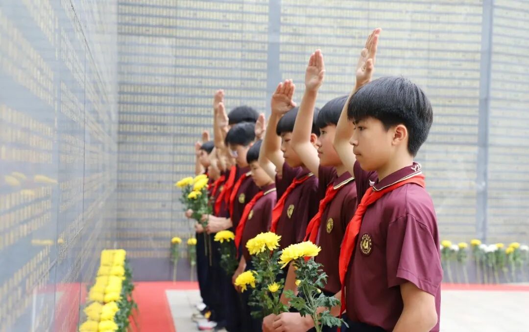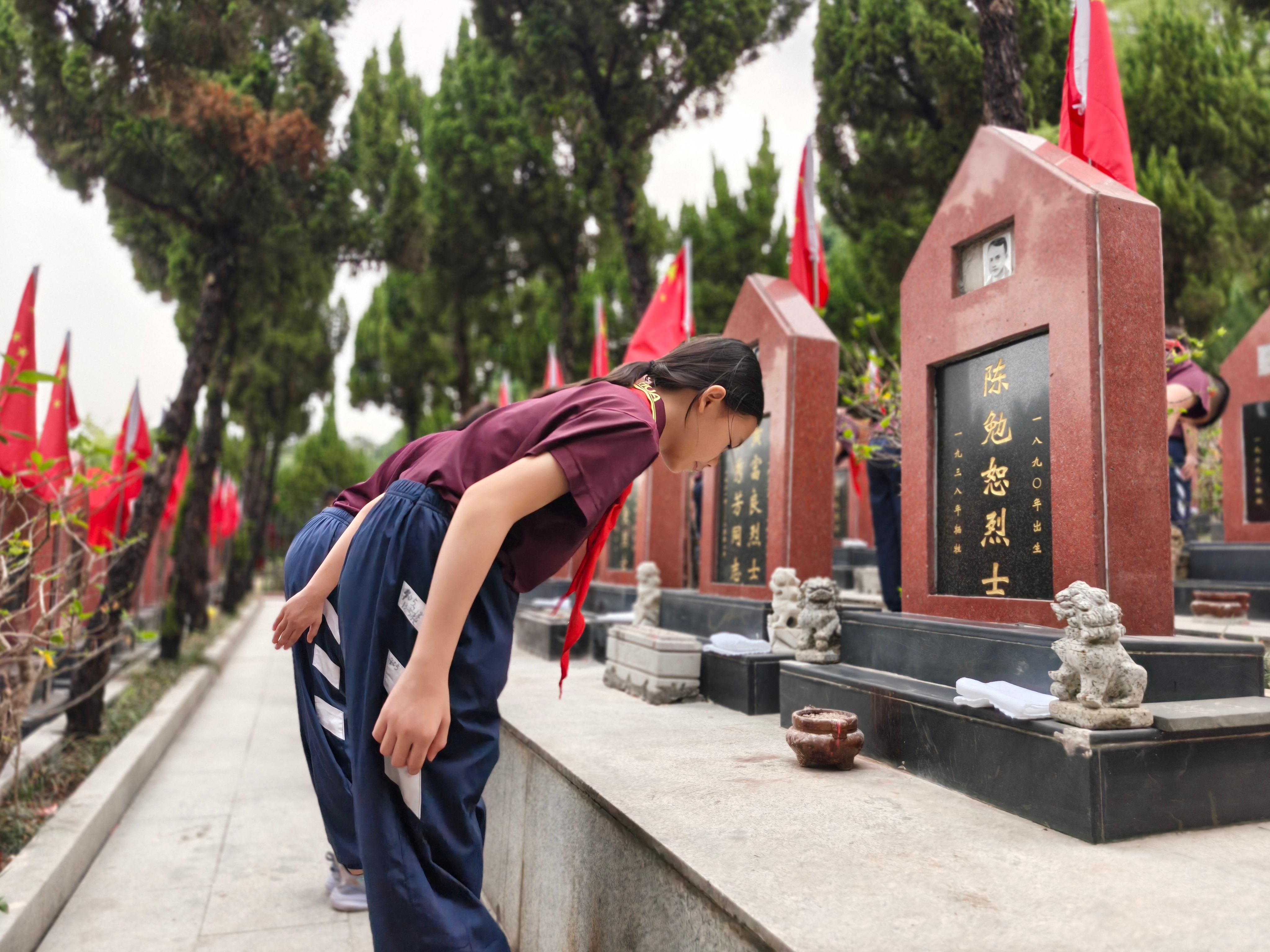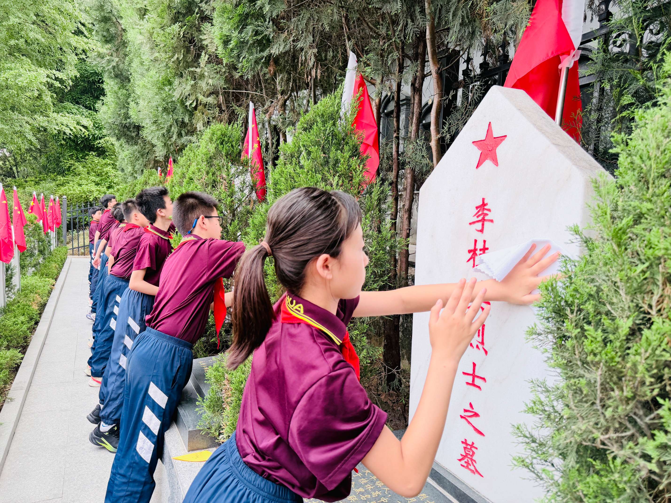 各班师生来到英烈苑,俯身轻拭墓碑,献上亲手写下的寄语,表达无限崇敬。