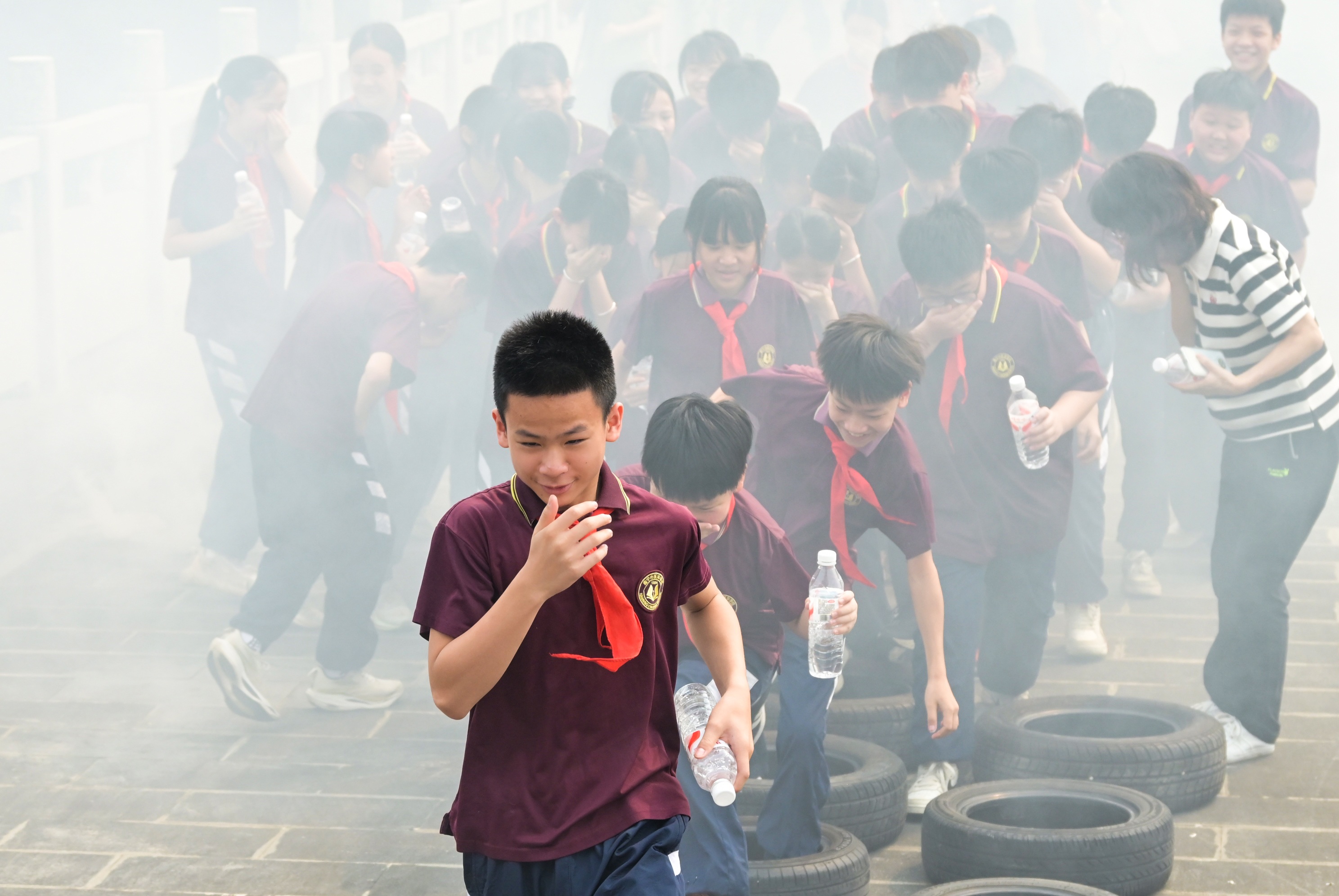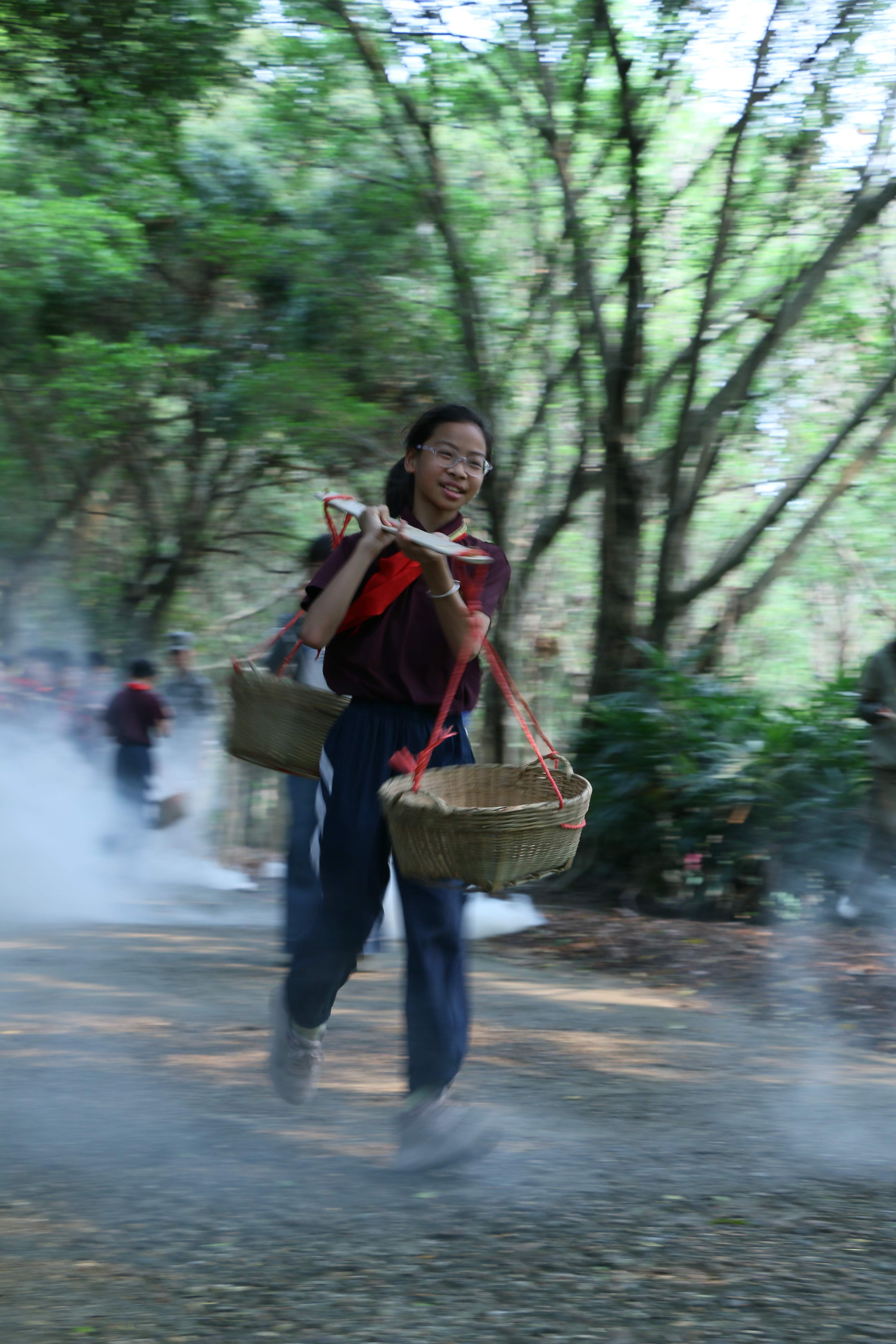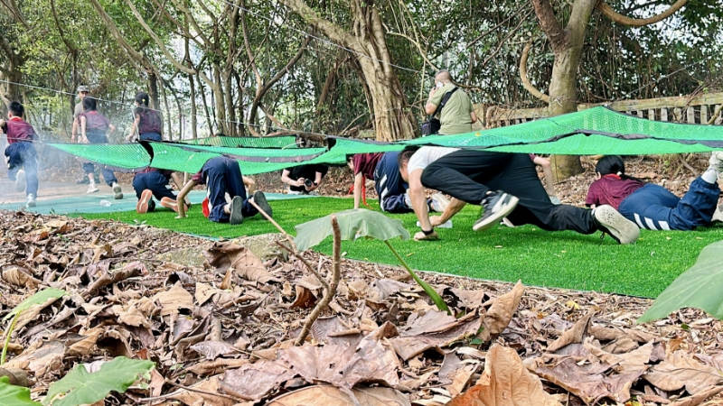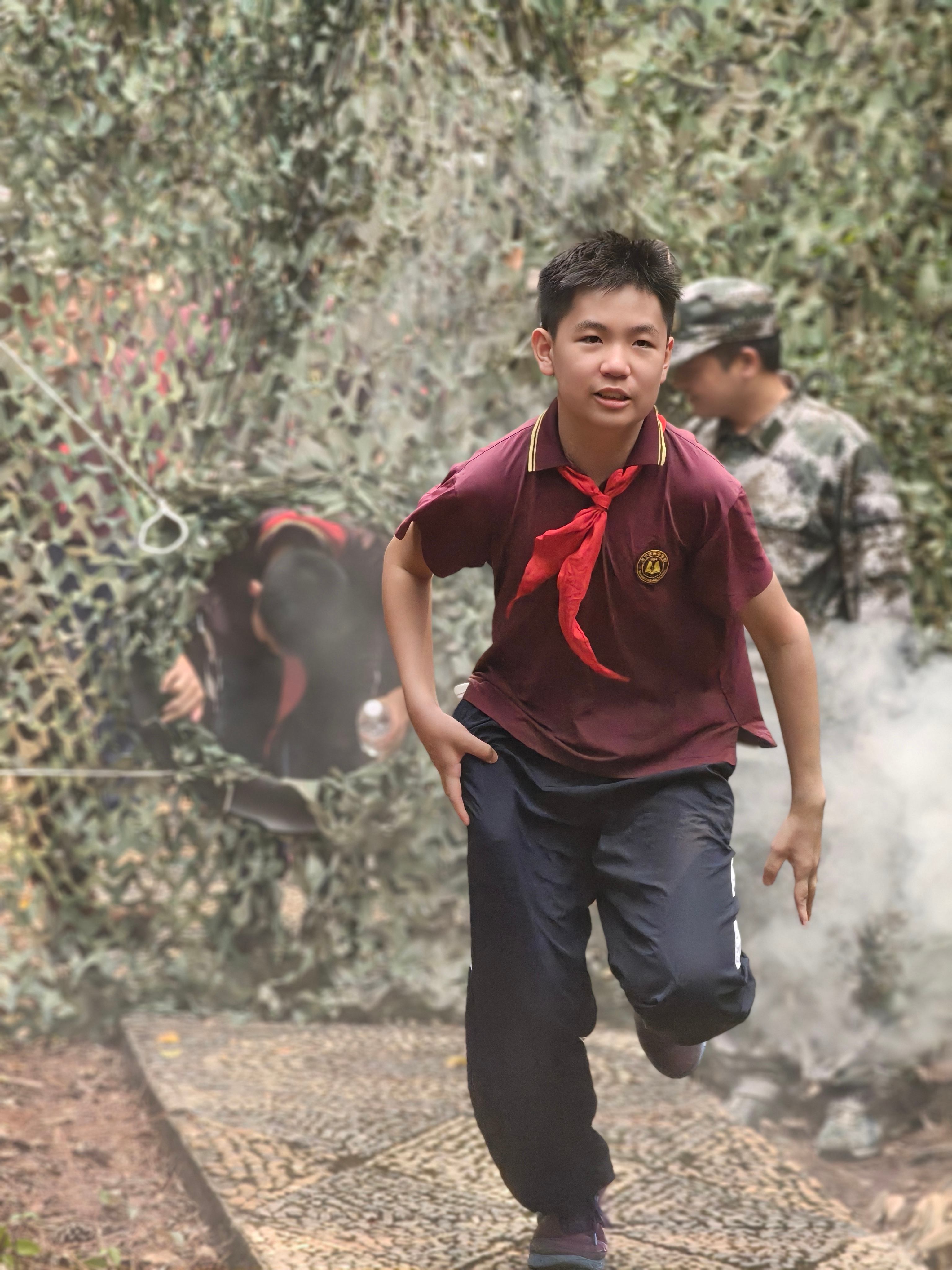 少先队员沿着两条动线“重走长征路”,模拟“匍匐前进”“飞夺泸定桥”,在汗水中感悟长征精神。