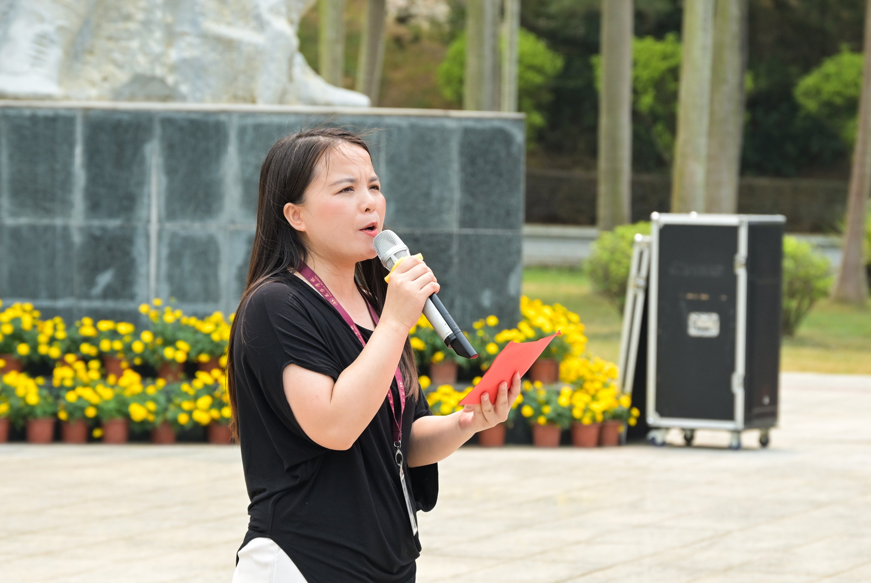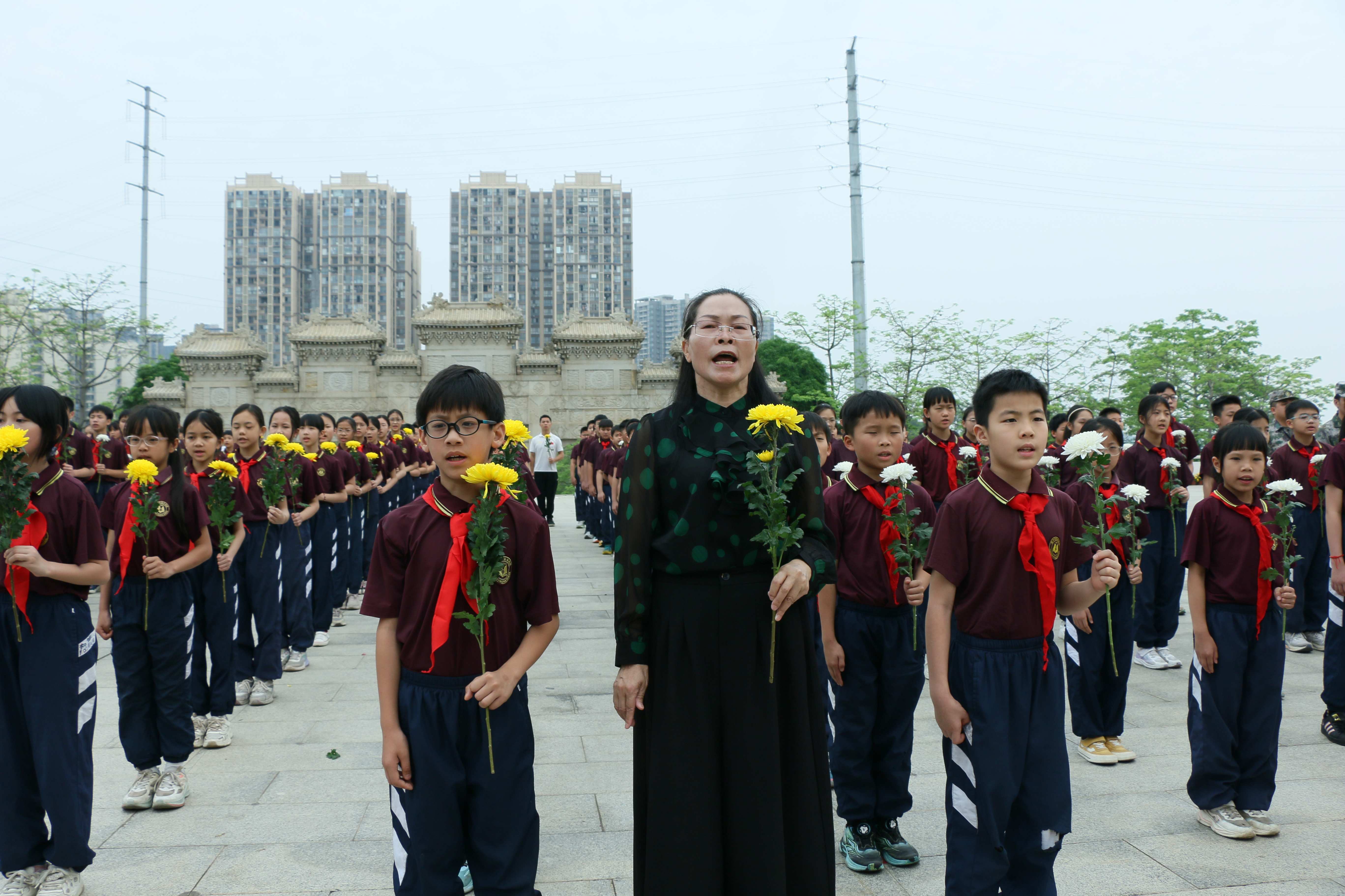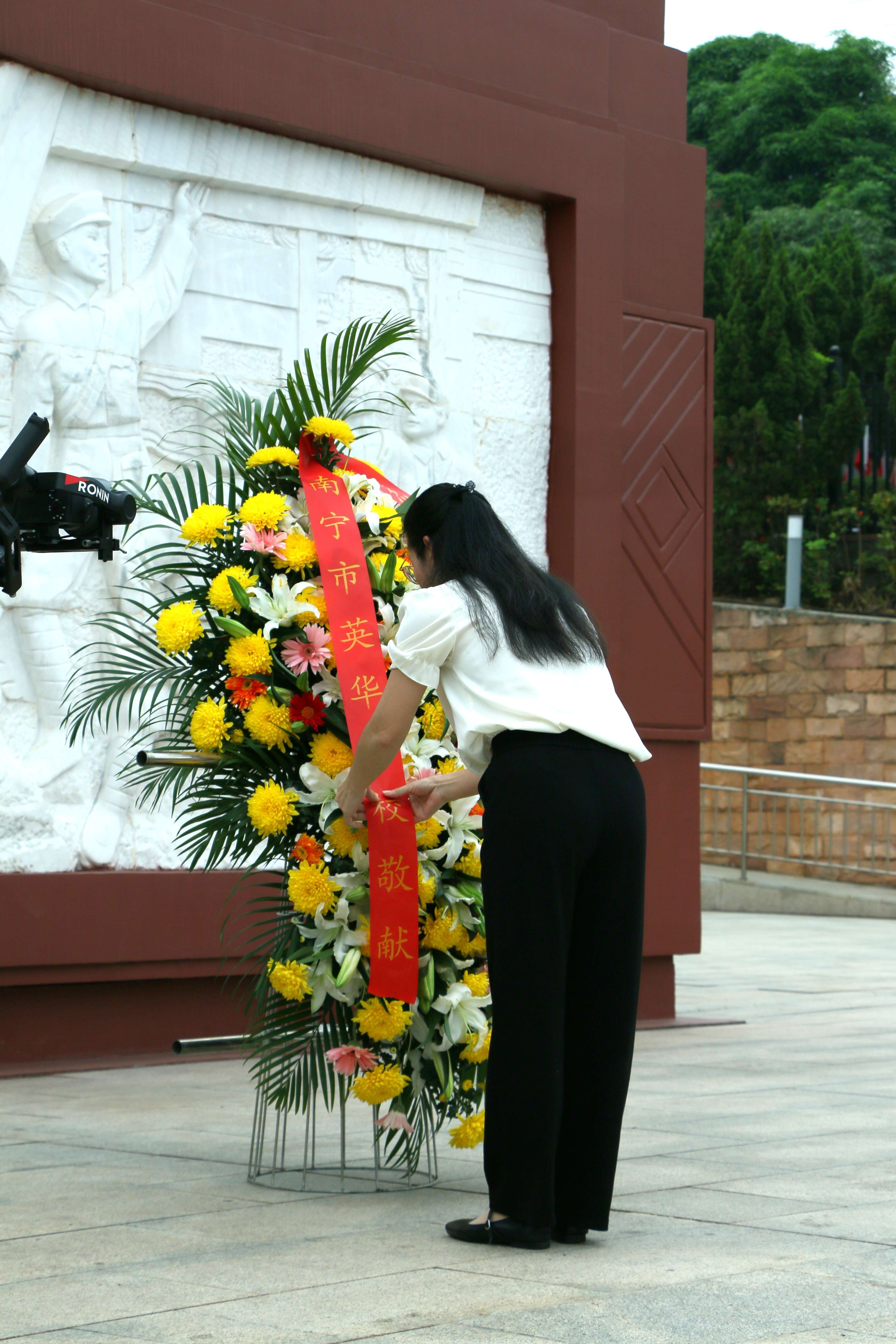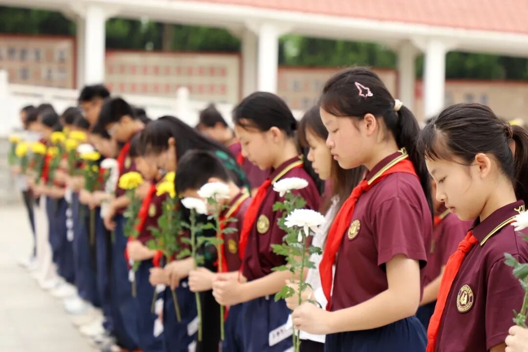 上午9时,出旗、奏唱国歌、集体默哀,少先队员齐唱《我们是共产主义接班人》。礼兵敬献花篮,学校党支部组织委员吴爱娥同志整理缎带。现场庄严肃穆,全体人员深切缅怀,致敬英烈。