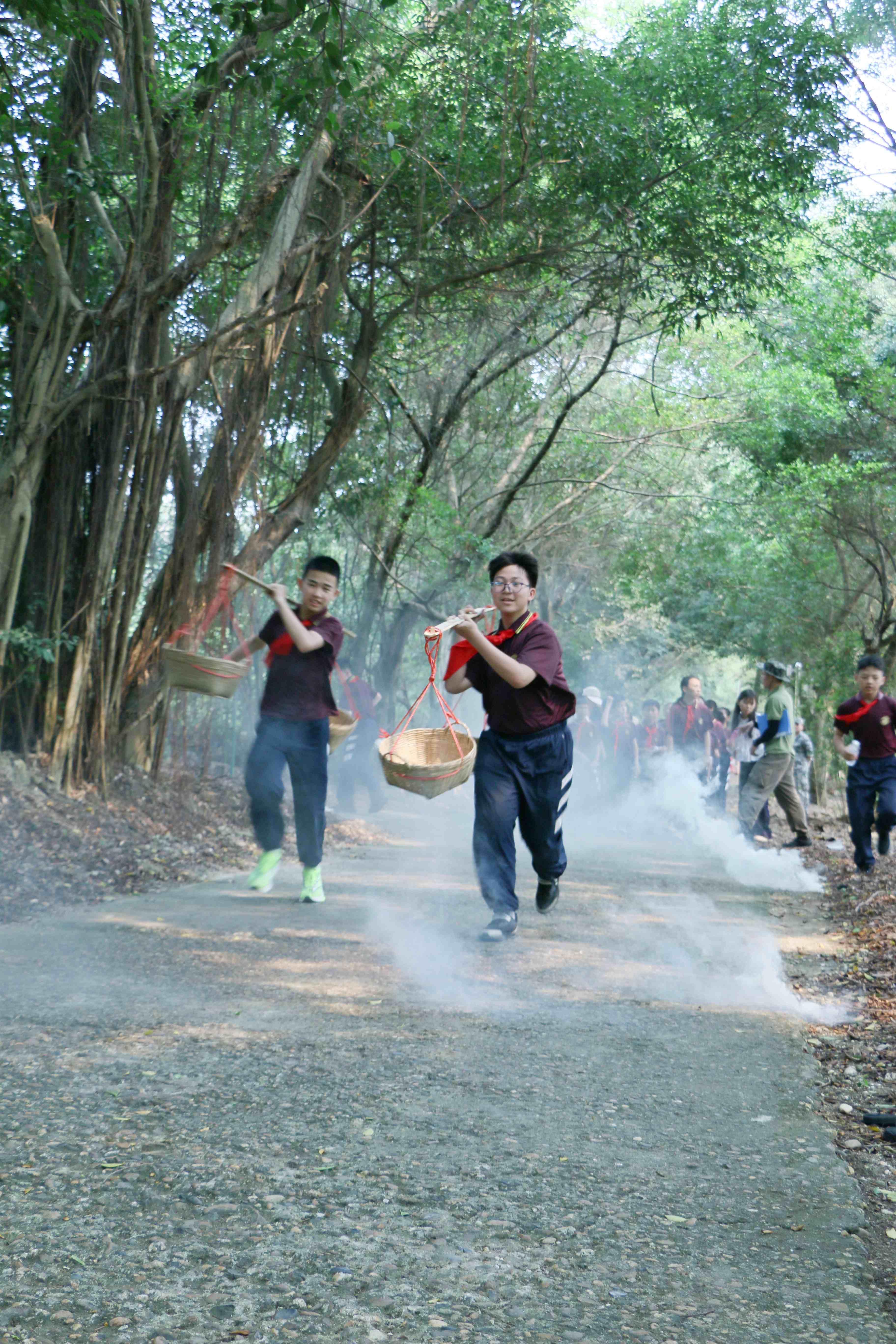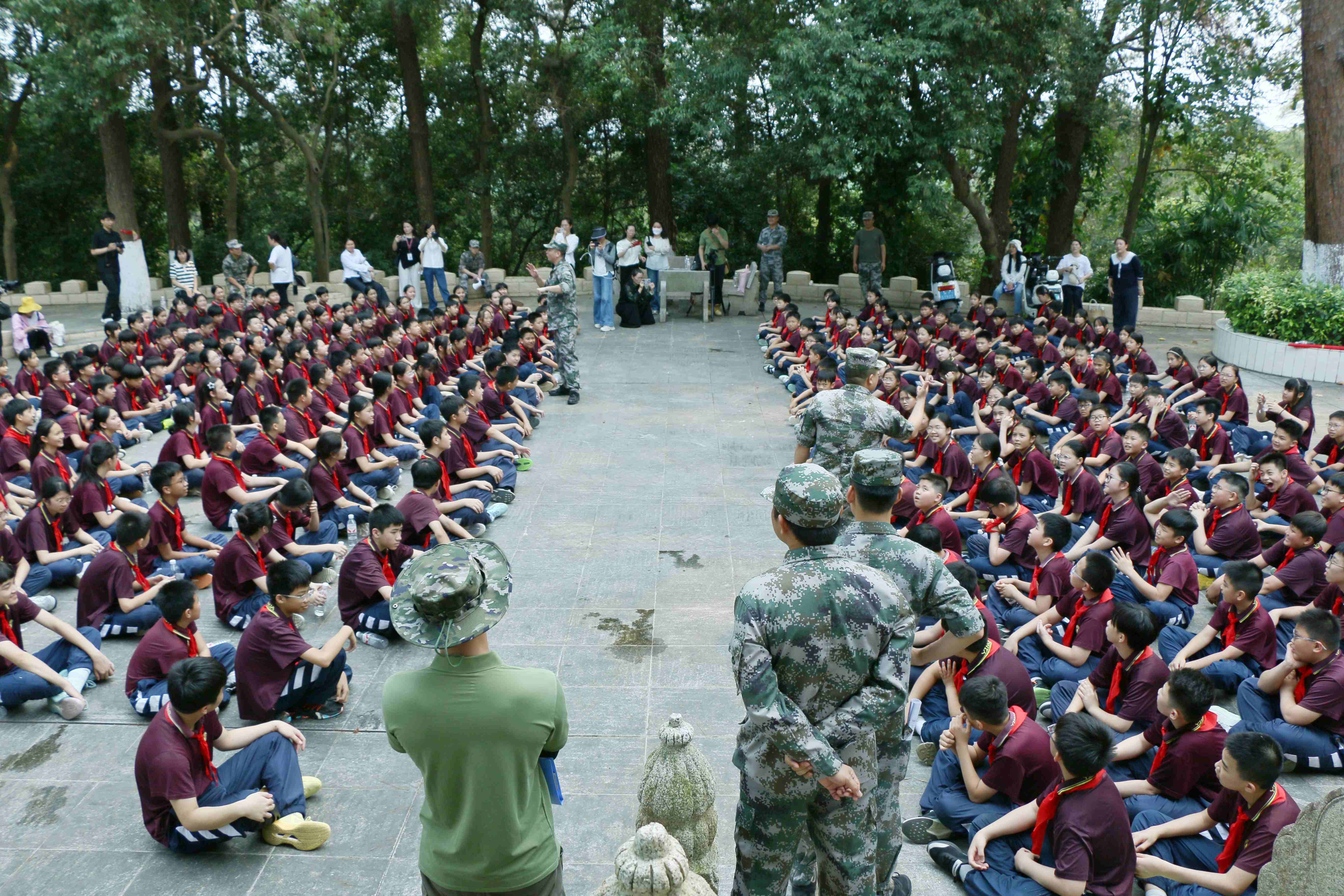 “长征”途中,教官组织红歌拉练。《人民军队忠于党》《团结就是力量》在陵园上空嘹亮回荡。