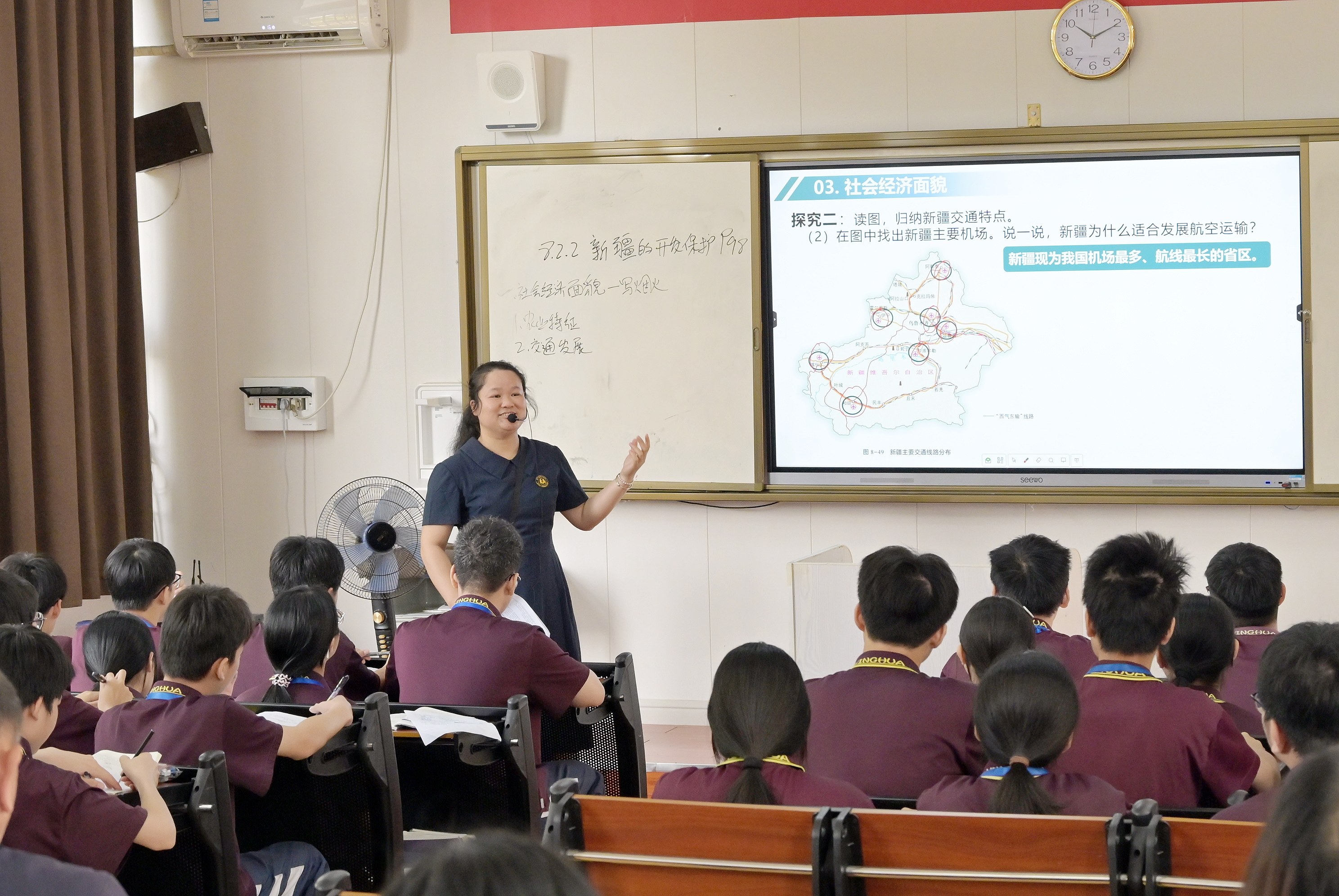 文科组课堂诗意灵动、氛围热烈。政治复习《富强与创新》目标清晰;英语《Delicious memories》《Go in a “green” way》情境真实;语文《动物儿歌》童趣盎然,《卖油翁》以读悟理;历史《金与南宋对峙》引人入胜;地理《新疆》厚植家国情怀。