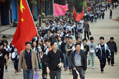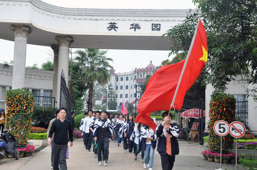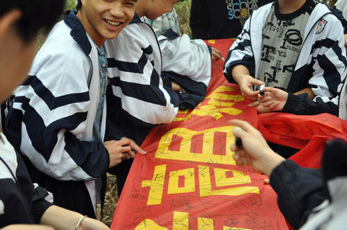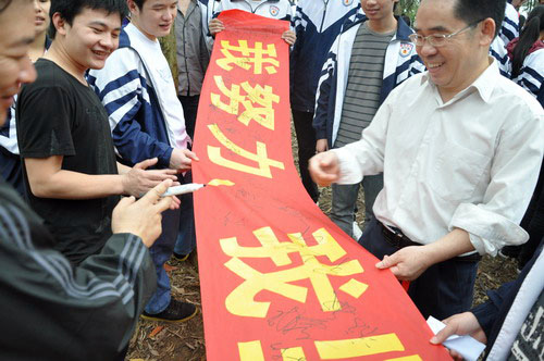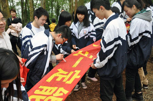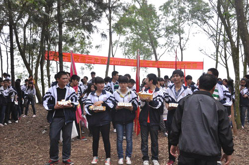 ▲3月16日下午,高三年级到五象岭森林公园举行“登山励志暨高考80日冲刺誓师”活动。教导处副主任苏开杰为最先到达的前五个小组的同学颁奖;副校长李维屏为高考80日冲刺作动员讲话,各班同学在李副校长的鼓励下齐声宣誓:不负父母期盼,不负老师厚望,不负青春理想。从今天做起,全力以赴,用信念实现梦想,让青春绽放火热六月里最美丽的光芒。全体高三教师宣誓:精诚团结,脚踏实地,为同学们保驾护航,与同学们同甘共苦,备战高考,创造辉煌。