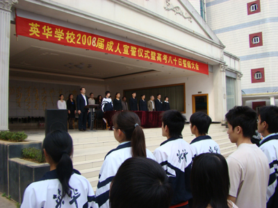 雄壮的国歌声后,是英华学子十八岁的庄严宣誓,“十八岁,我们对社会负责,十八岁不在是顽劣少年.....”这是3月18日下午高中部2008届同学的宣誓,也是他们成人的誓词,高中部全体师生与应邀的部分家长在3月18日下午共同见证了这一刻。