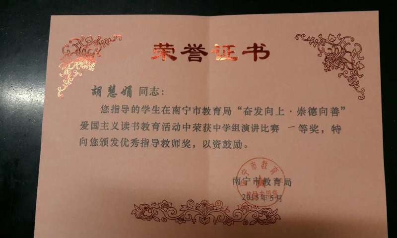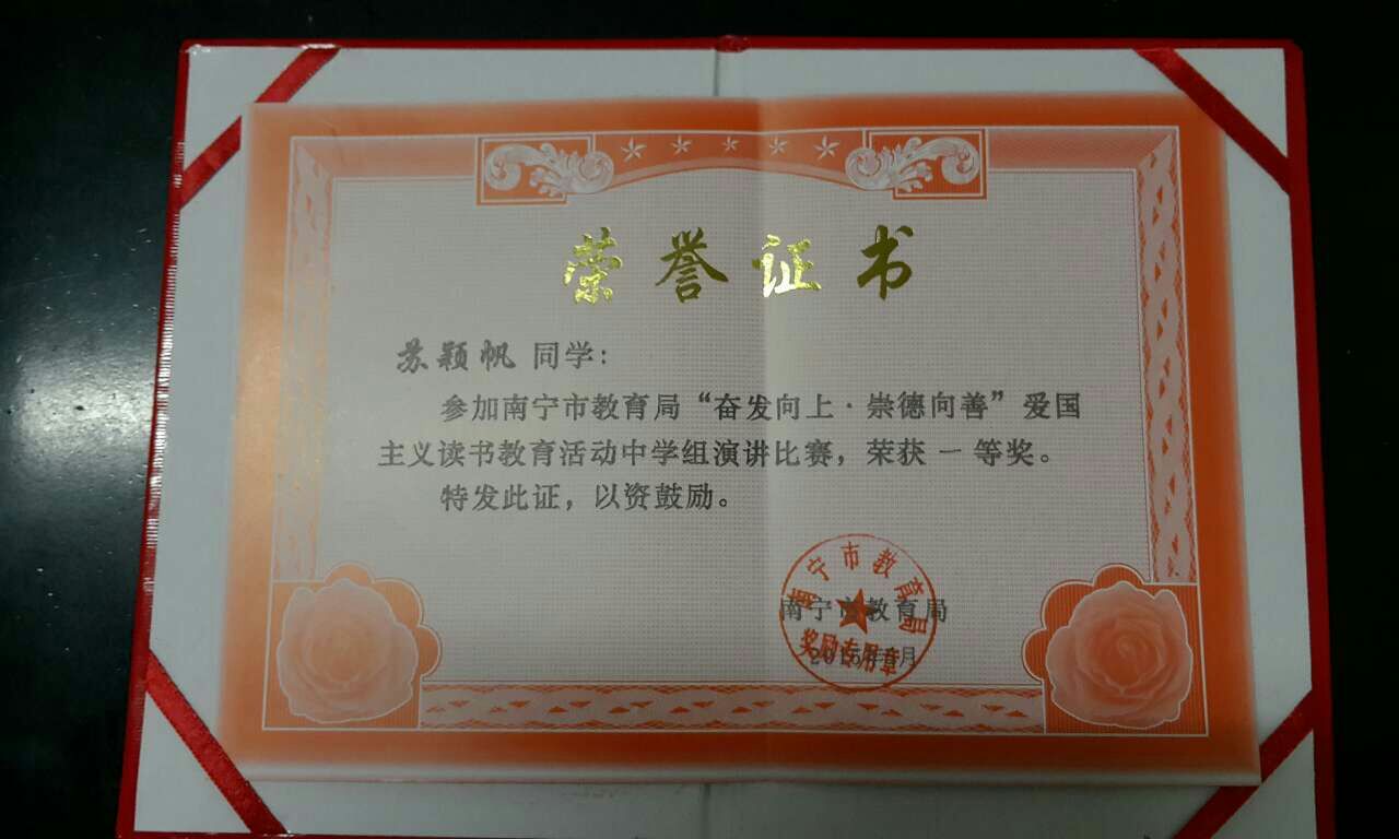 南宁市英华学校高二(1)班苏颖帆同学于2015年5月5日上午在南宁市教育局组织的“奋发向上,崇德向善”爱国主义读书教育活动的中学组演讲比赛中荣获一等奖,(四个一等奖中的最高分),她将继续代表南宁市参加全区的比赛。胡慧娟老师获得优秀指导教师奖。特向各位领导,老师和同学报喜。