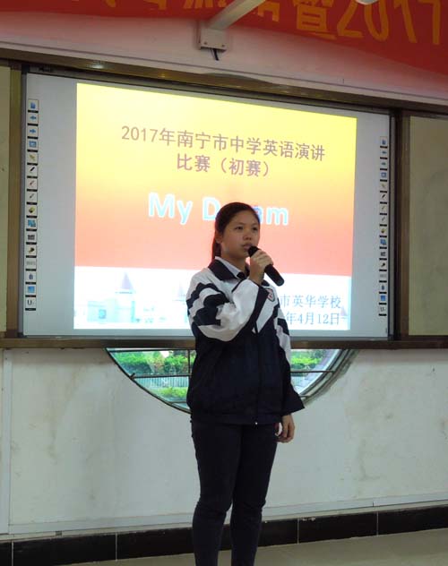 为选拔优秀学生参加南宁市英语演讲比赛,同时丰富校园文化生活,提高学生英语学习的积极性,给学生提供一个展现自我的平台,4月12日下午,南宁市英华学校校高中部组织学生在高中部阶梯教室举办了2017年南宁市中学生演讲比赛初赛,分管高中部副校长奚智,高中部主任潘嘉智,副主任蒲庆双出席了活动。