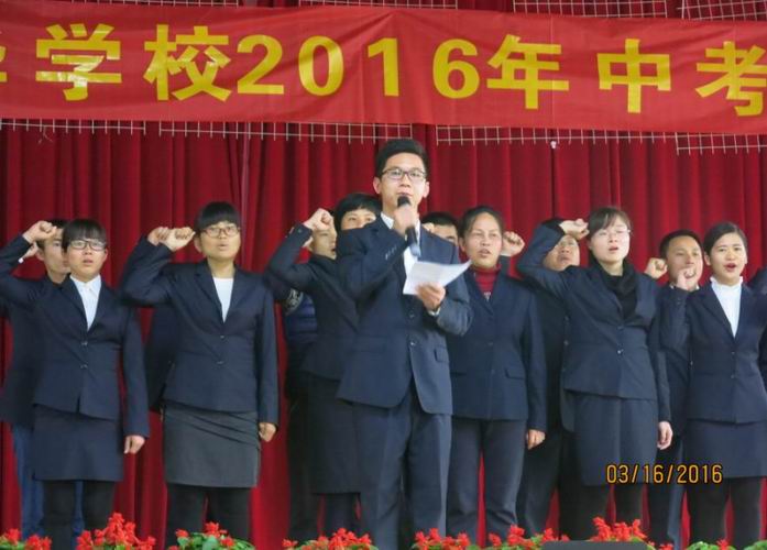接着,毕业班的全体教师三十多人向大会宣誓:“忠于职守,精诚团结,甘于奉献,同甘共苦,风雨同舟,决战百日,创造辉煌。”铿锵的誓言,表达老师们为本届中考获得良好成绩的坚强决心,也透出老师们恪尽职守,爱生敬业的工作态度。他们的誓言,如春风中的细雨,滋润、感动、激励着在场的每一位学生。