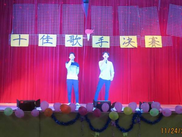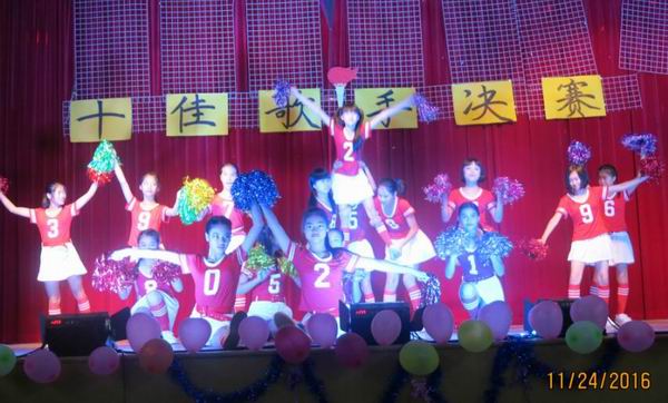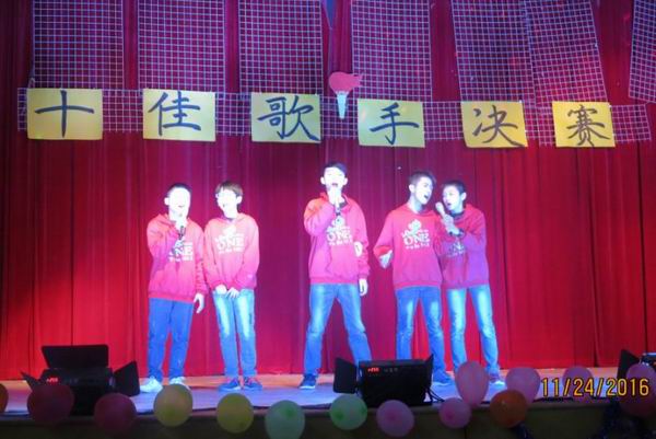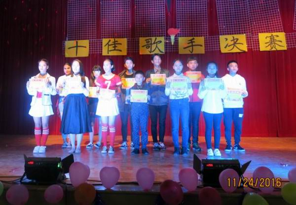 为了丰富校园文化生活,努力营造积极向上、健康文明的校园文化气氛,为学生提供展示自己才华的舞台,11月24日晚英华学校初中部第一届校园十佳歌手决赛在学校演播厅隆重开唱。比赛伊始,初一年级三位同学的舞蹈串烧和尹淑兰老师特地为本次比赛编排的舞蹈《向前冲》,使人眼前一亮,引领导大家high起来。歌曲《至少还有你》的音乐一起,就预示着比赛的开始,台下同学们热情高涨,呐喊着为上台的每一位选 手加油、鼓劲、助威。《别找我麻烦》、《方圆几里》、《我的歌声里》、《淋雨一直走》等一首首歌曲将比赛现场的气氛带动得淋漓尽致。最终,经过评委的评判,十位选手脱颖而出,荣获“校园十佳歌手”称号。比赛结束时,在老师的带领下,师生齐唱《精忠报国》把晚会推向高潮。这次比赛展现了初中部学子多才多艺、健康向上的精神风貌,通过小小舞台实现了同学们青春的梦想,展现了努力拼搏、天天向上的精神风貌。