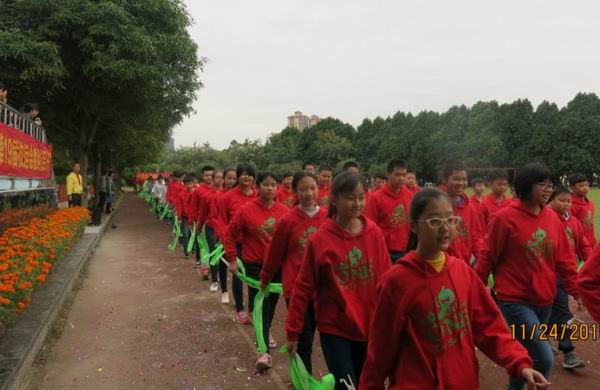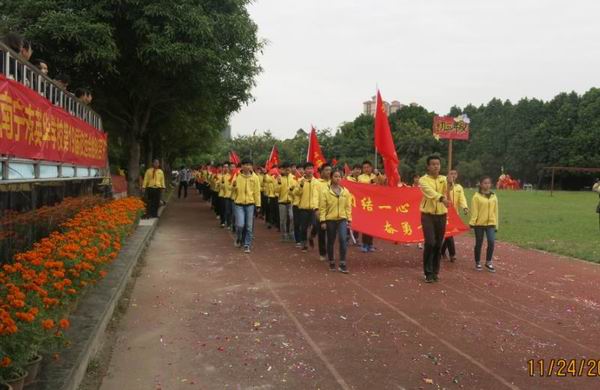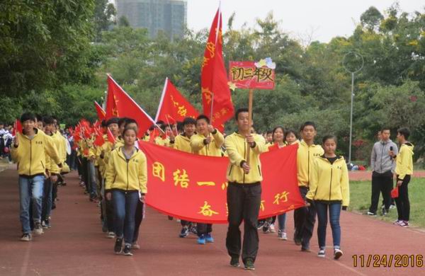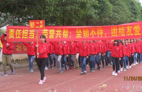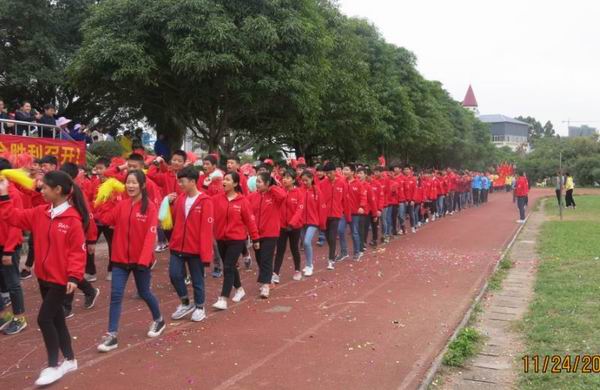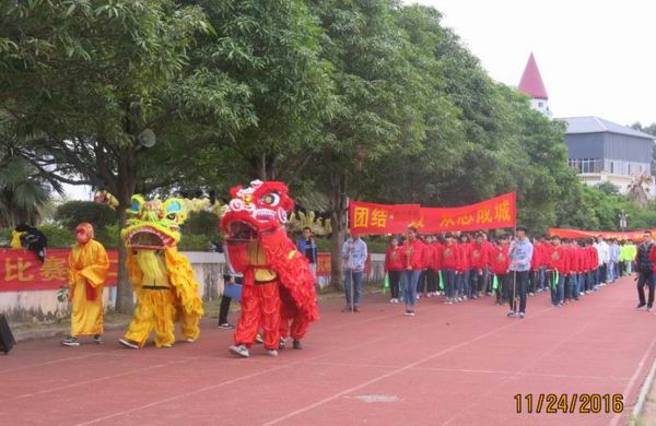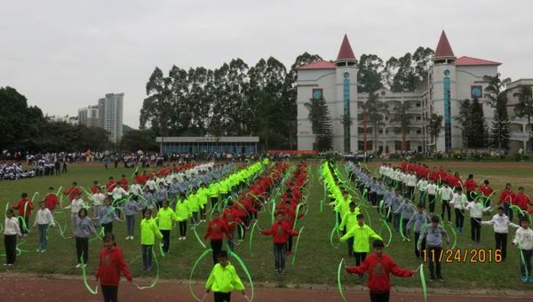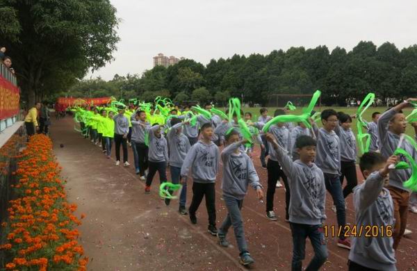 2016年11月24日我校迎来了第19届校运会。校运会入场式中,初中部全体师生在学生舞狮队的带领下,精神抖擞、踌躇满志地走过主席台。队列整齐、步伐有力、口号响亮的初中部方块队,展现了初中部全体师生新的风貌、新的气象、新的志向!初一年级方块队在开幕式表演的《中国范》彩带操把学校的运动会推向了高潮!