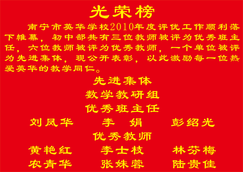 2010年南宁市英华学校初中部优秀教师