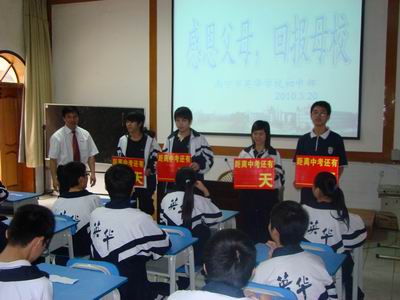 大会首先是09届初中毕业生代表王扬、韦光立同学发言:他们给学弟学妹们传经送宝;接着家长李诚和教师代表卢丽珍发言,表达了对同学们的殷切希望;学生代表黄秋华发言,感谢老师和家长多年的培育,表达回报父母和母校的决心;宋金兰老师一曲《超越梦想》使会场群情激奋。各班同学高声宣读誓词:坚定信心,不遗余力奋战中考;彭斌尧主任给各班授“中考倒计时牌”;韦平凡校长做了题为“努力拼搏,做最好自我”的讲话,鼓励同学们认真备战中考前的90天,用实际行动去践行自己的誓言,立足今天,努力拼搏,改变昨天,做最好自我,迎接美好明天,实现并超越自己的梦想!最后,初中部彭斌尧主任鼓励同学们:学校和家长对你们寄予厚望,相信你们能够通过自己的努力,创造英华学校中考辉煌。
