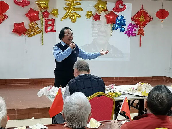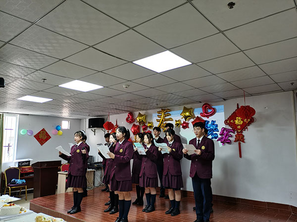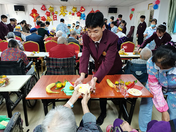 同学们为14位长者举行集体生日会,全场共唱生日祝福歌曲,分享生日蛋糕和水果,学生代表给在场的老人送上祝福的礼品。