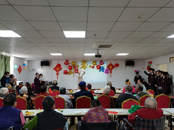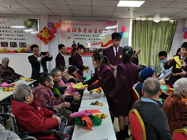 菊花吐蕊,桂花含香。岁岁重阳,今又重阳。农历九月初九是我国的传统节日重阳节,为营造尊老、敬老、爱老和健康、温馨的氛围,10月24日上午我校团委学生会14名同学在陆强华校长、潘嘉智副校长及高中部领导、老师的带领下来到南宁市中科护理院开展慰问活动。