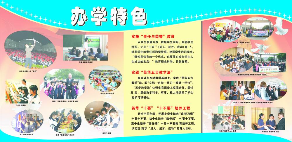 学校历来注重特色办学,并已形成办学特色,特别是在德育方面,以“责任与荣誉”育人,着眼于培养学生成人、成才、成功,已取得了较好的效果。 1995年,英华学校根据学校的生源情况提出了体现学校办学新理念的校训:责任与荣誉,并以“责任与荣誉”教育作为学校德育的核心,与此时同,学校首创了符合素质教育精神的教育理念:“哪怕是仅有的一个优点,也要使它成为学生人生成功的支点”,因此,学校特别注重做好几个方面:一是培养学生的责任心;二是培养学生的荣誉感;三是注重寻找学生的闪光点。 坚持“责任与荣誉”为核心的育人主线特色,加强对学生心理健康教育和国防教育,促进学生形成完整人格。学校努力优化学生的成长环境,努力构建“社区与学校、教师与家长、教师与学生、家长与孩子、孩子与孩子”的“五个和谐”。