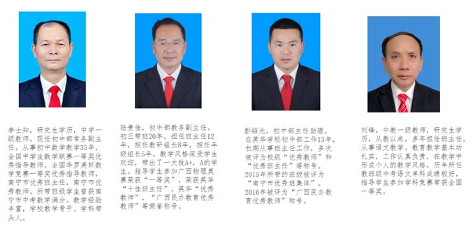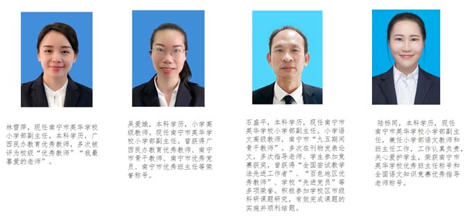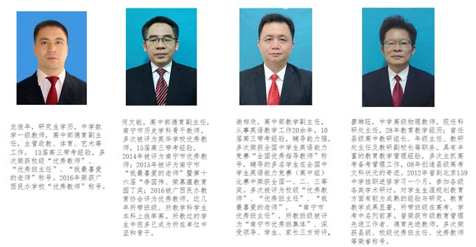 现有专任教师270人,是一支敬业爱生、经验丰富、专业素质较高的师资队伍。其中特级教师、高级教师、自治区、南宁市优秀教师、广西民办学校优秀教师、南宁市“我最喜爱的老师”、市学科带头人和市教学骨干共70余人。以下为我校部分骨干教师: