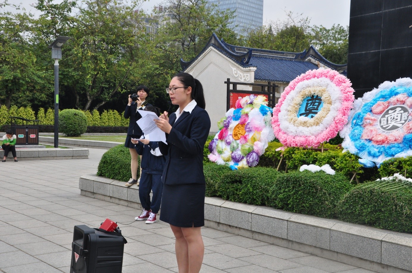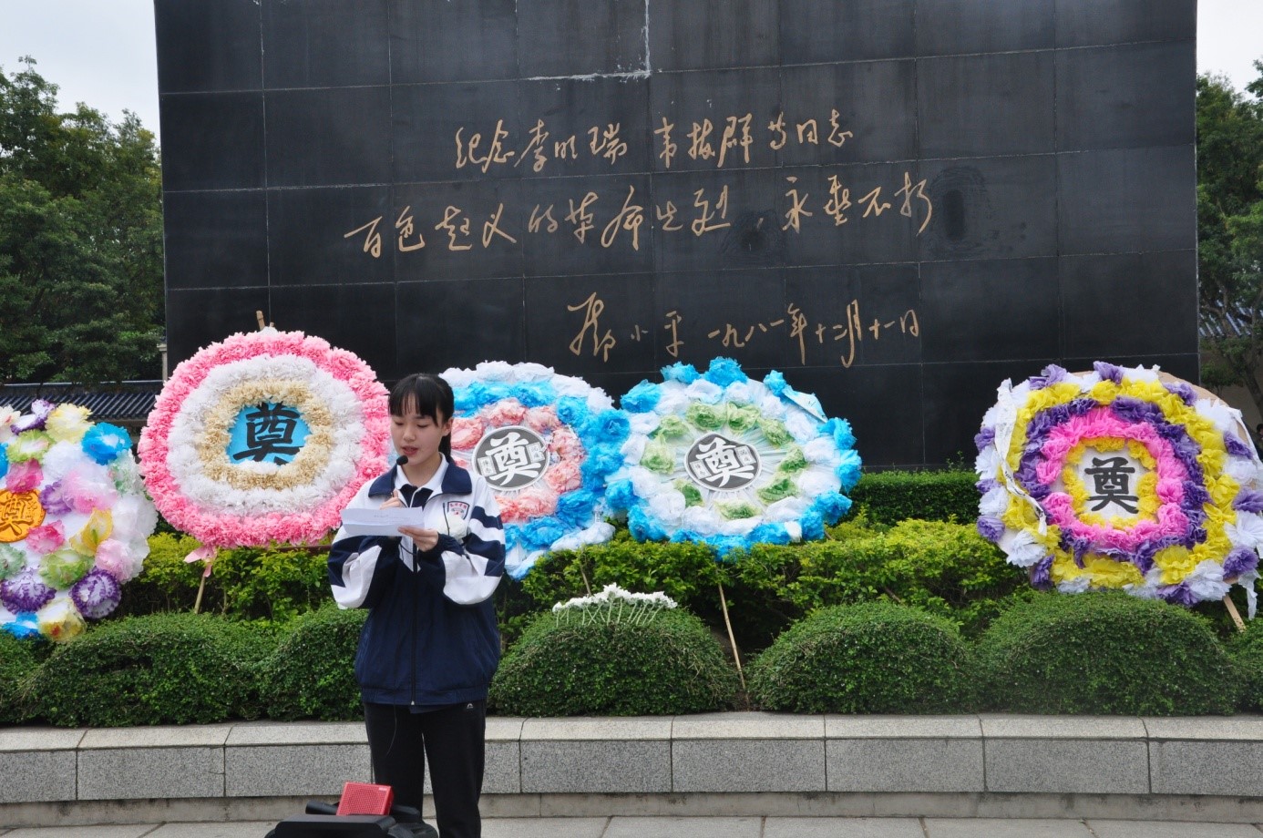 祭奠仪式开始了,师生胸前佩戴小白花,学生代表手持花圈,大家整齐地肃立在烈士纪念碑前,团委书记韦雪老师讲话。她说:我们举行隆重的祭奠革命烈士活动,就是在瞻仰革命烈士纪念碑的同时,了解学习革命先烈的感人事迹,做新时代的“四有”新人,让英烈见证我们的成长,将来勇敢地担负起民族振兴的神圣使命。