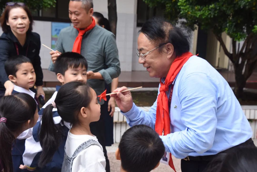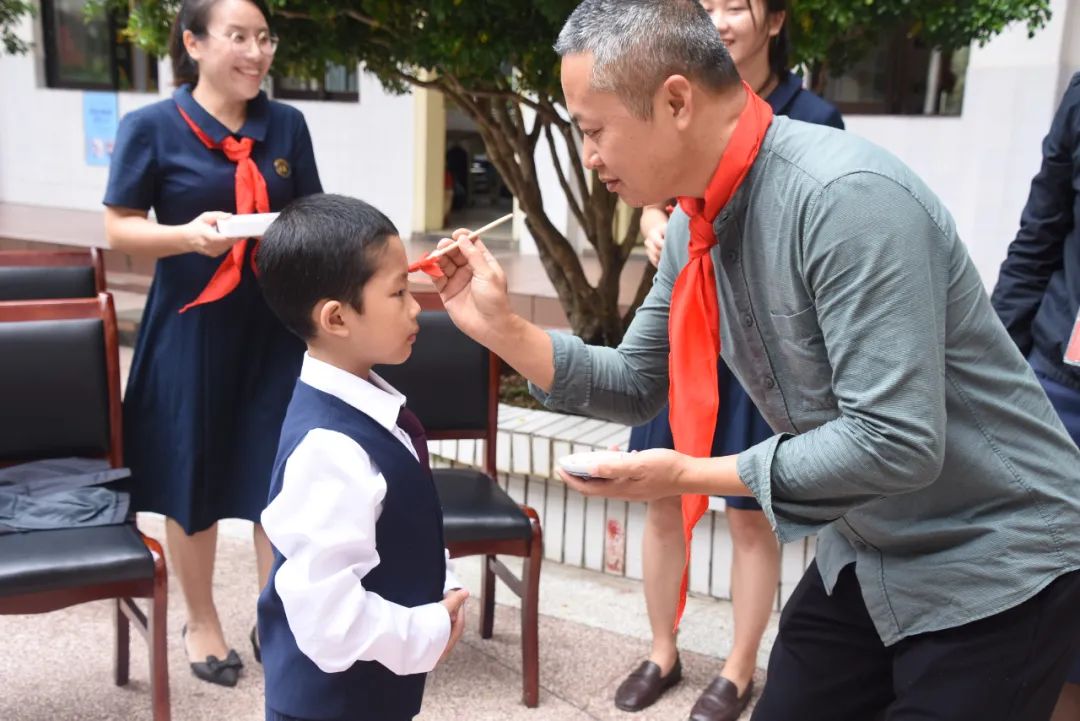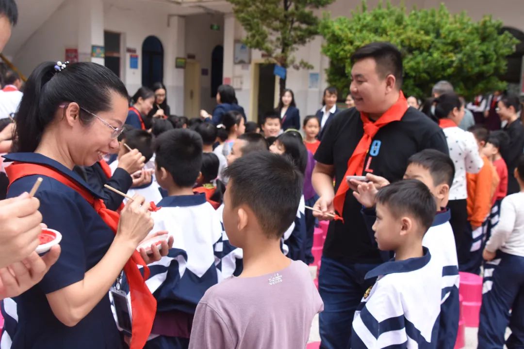 开启智慧,点亮校园。学校领导、老师及家长代表为一年级新生点朱砂。